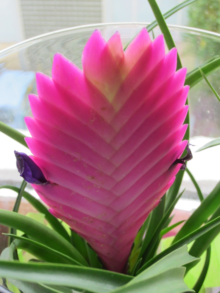 Der aus zahlreichen glatten, sich überlappenden, rosafarbenen Hochblättern bestehende Blütenstand hält sich etwa 2 1/2 Monate. Die Blüten bilden sich einzeln in den von den Hochblättern am Rand der Blütenähre gebildeten Zwischenräume. Die Einzelblüte ist röhrenförmig und besteht aus 3 zum Rand hin flach ausgebreiteten Blumenblättern. Die Blütenfarbe ist violett-blau. Wie bei fast allen Bromelien blüht die Blattrosette nur einmal und stirbt dann langsam ab. In den Blattachseln entwickeln sich Seitensprosse, die man zur Vermehrung benutzen kann.