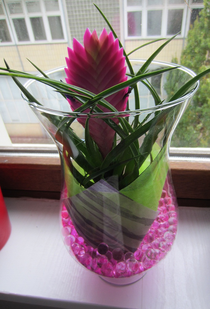 Die Blümie ist in nem Topf mit Erde der wiederum ist von dünnem Papier umwickelt und alles zusammen steht auf diesen Wasserbubbles in dem Glasdingens.