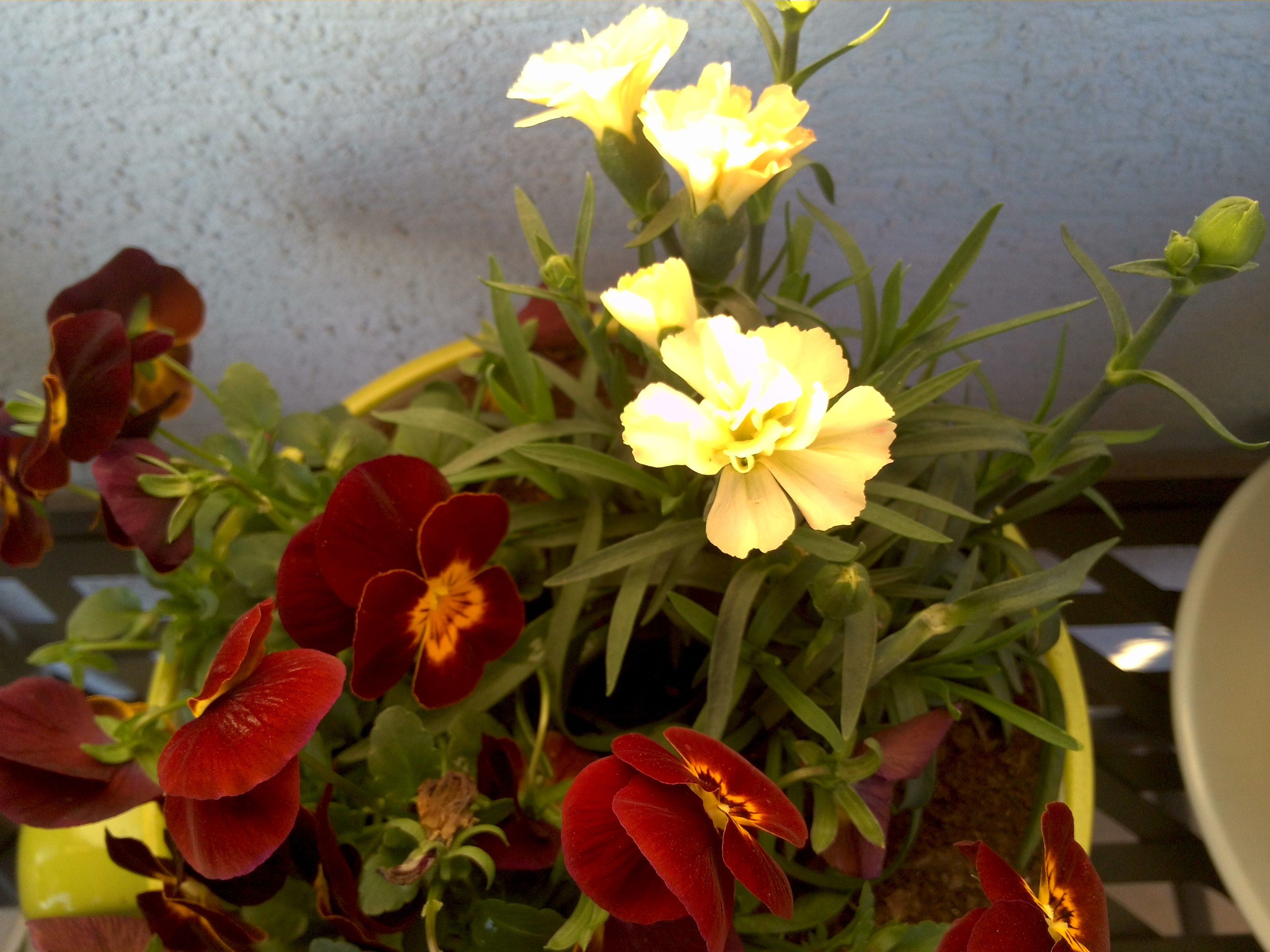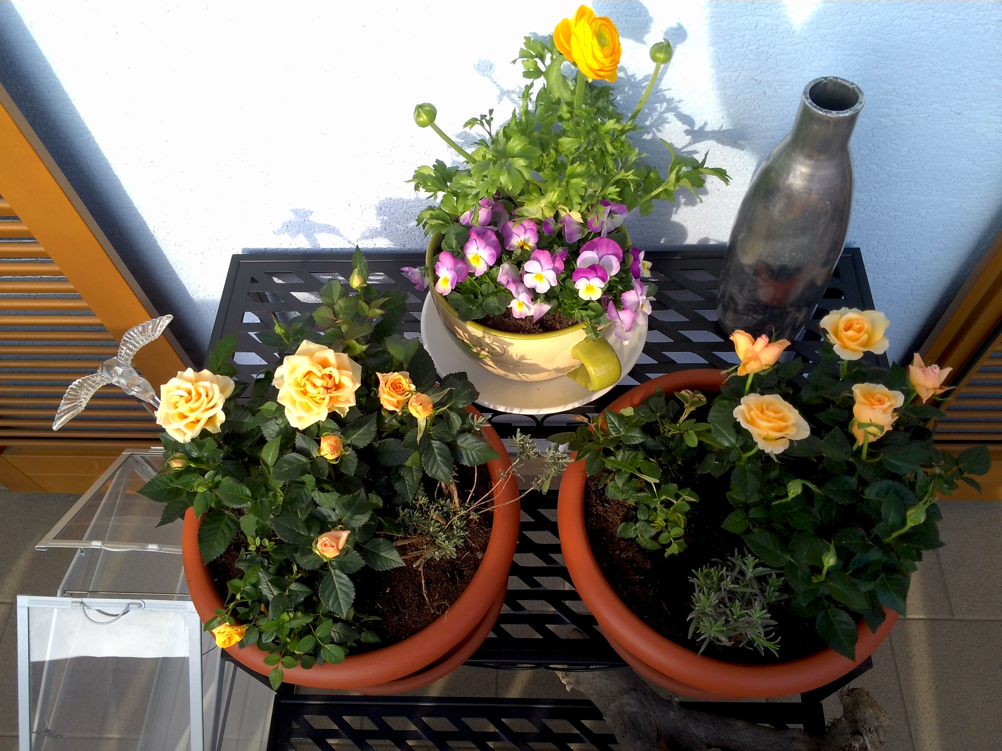 Heute sind diese Gesellen auf meinen Balkon gezogen. 2 Topfrosen, 2 Hornveilchen und 1 Ranunkel. Meinen Lavendel und meine Minirosen hab ich gleich dazugesetzt.[attachment=1]1395155068631.jpg[/attachment][attachment=0]1395155157238.jpg[/attachment]