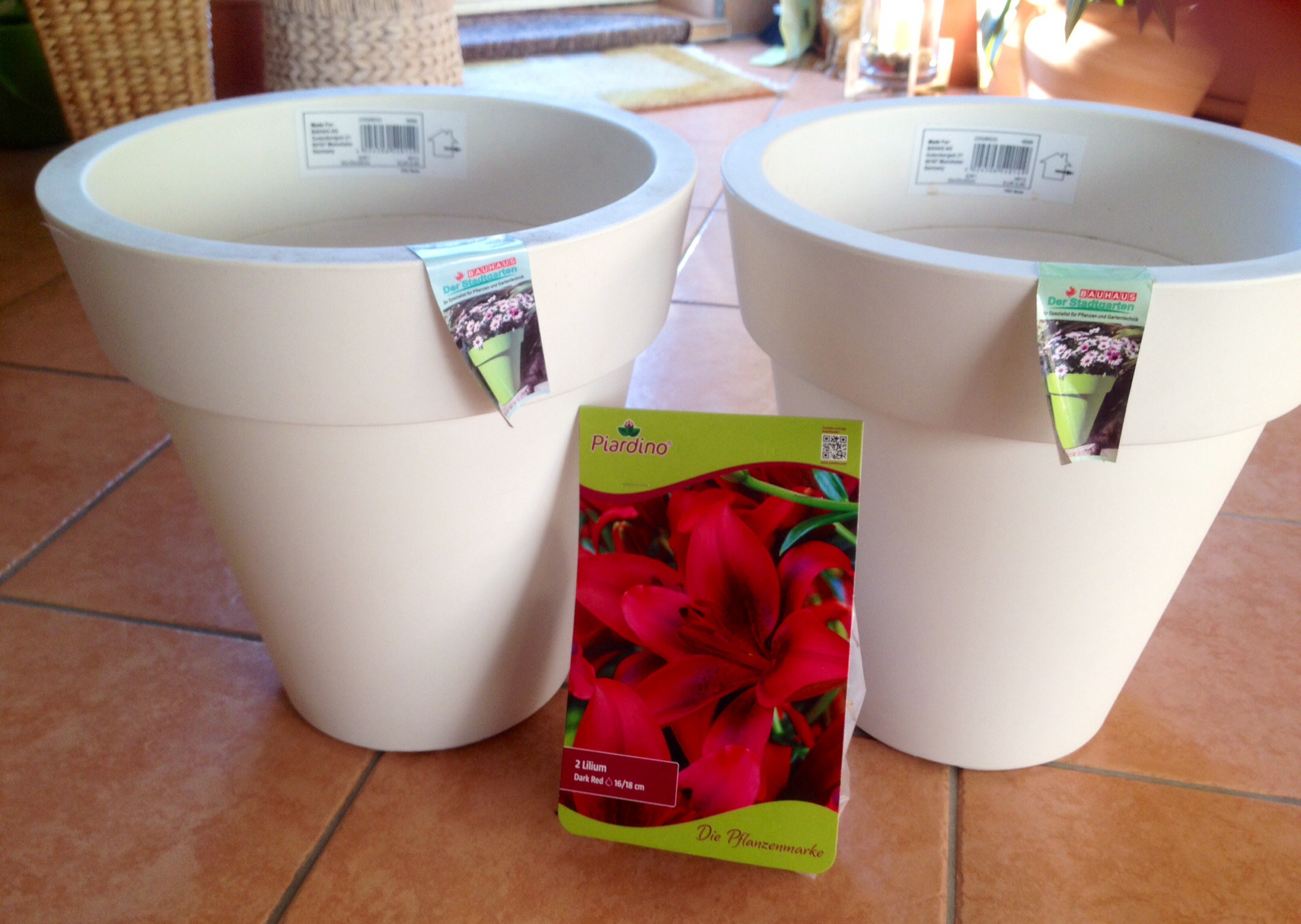 Die Kübel (für Terrasse oder Balkon) waren auf je 4,99 reduziert (davon kann man ja nie genug haben),na ja.....und die Lilien......so ein dunkles Rot hab ich noch nicht......