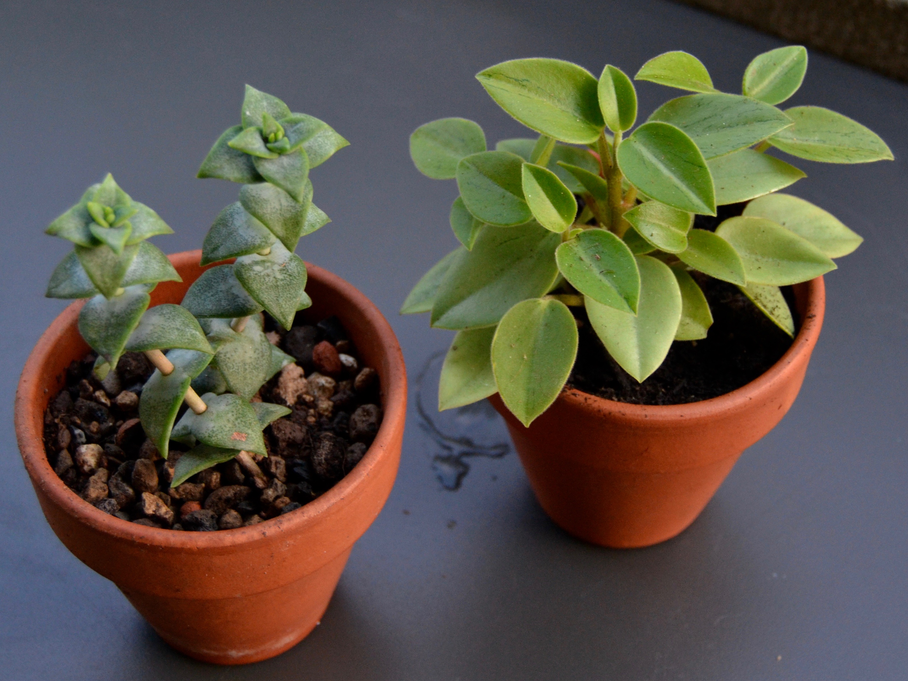 Ersteren interpretiere ich als Crassula 'Springtime', beim zweiten handelt es sich um Peperomia orba - diese habe ich schon zweimal in der panaschierten Form im Supermarkt gekauft, jedoch waren beide jeweils patschnass und sind dann auch innert kurzer Zeit weggefault