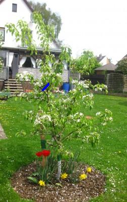 übrigens ist mir im letzten Beitrag ein Fehler unterlaufen (hört sich immer besser an als " ich habe einen Fehler gemacht"). Ich habe zweimal die Fotos vom gleichen Apfelbaum reingesetzt. Hier ist nochmal das Foto vom zweiten. Und der sieht, glaube ich, auch so aus als müsste man an der Spitze eingreifen, oder?