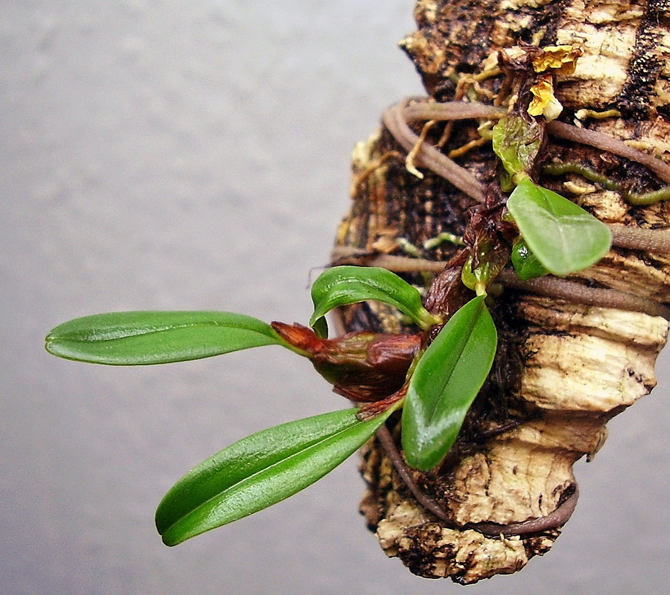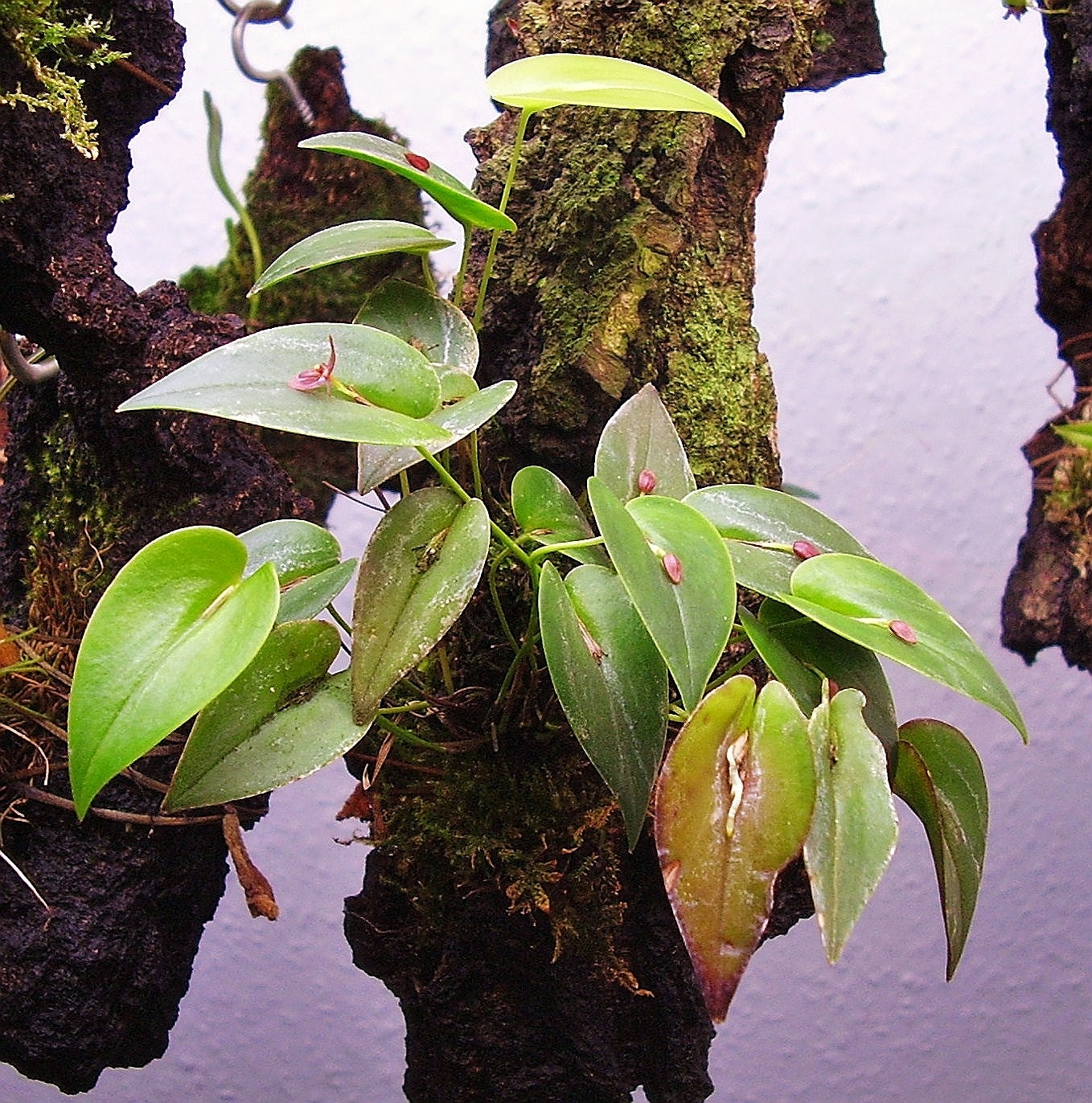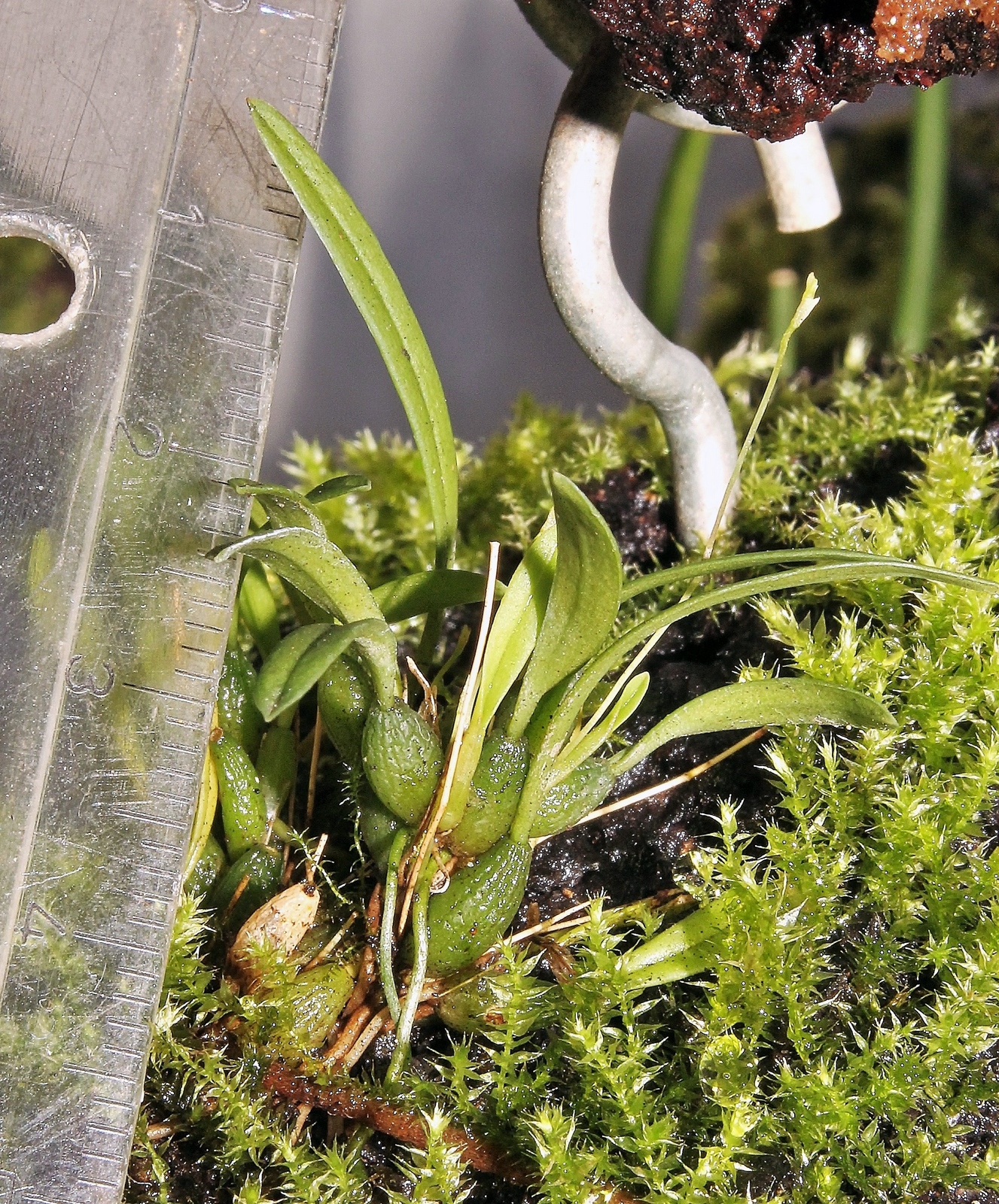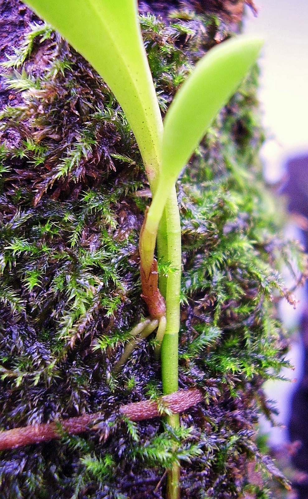 official&prmd=ivns&tbm=isch&tbo=u&source=univ&sa=X&ei=AApFTunyOsabOqyPnfAD&ved=0CEUQsAQ&biw=1366&bih=596]Stelis spec.[/url]: Die Pflanze habe ich bei uns in der Hamburger Gruppe vor ca. 5 Monaten bekommen. Nur ganz kurze Wurzelstümpfchen, dann 5 cm Stiel und oben drauf das Blatt, mehr nicht. Auf der Fensterbank wäre sowas nicht zu bewurzeln und auch bei mir hing die ganze Zeit nur das "Blatt" ohne einen Mucks zu machen in der Vitrine. Eigentlich hatte ich gehofft, das sie an der Basis wurzeln macht, aber dann wuchs oben an der Ansatzstelle zum Blatt der Trieb. Das machen die Pleurothallidinae sehr oft (z.B. Restrepia, Pleurothallis restrepioides). Jetzt wachsen die Wurzeln ins lebende Moos und der erste Trieb ist da.