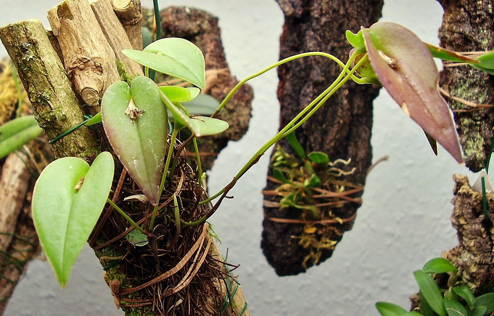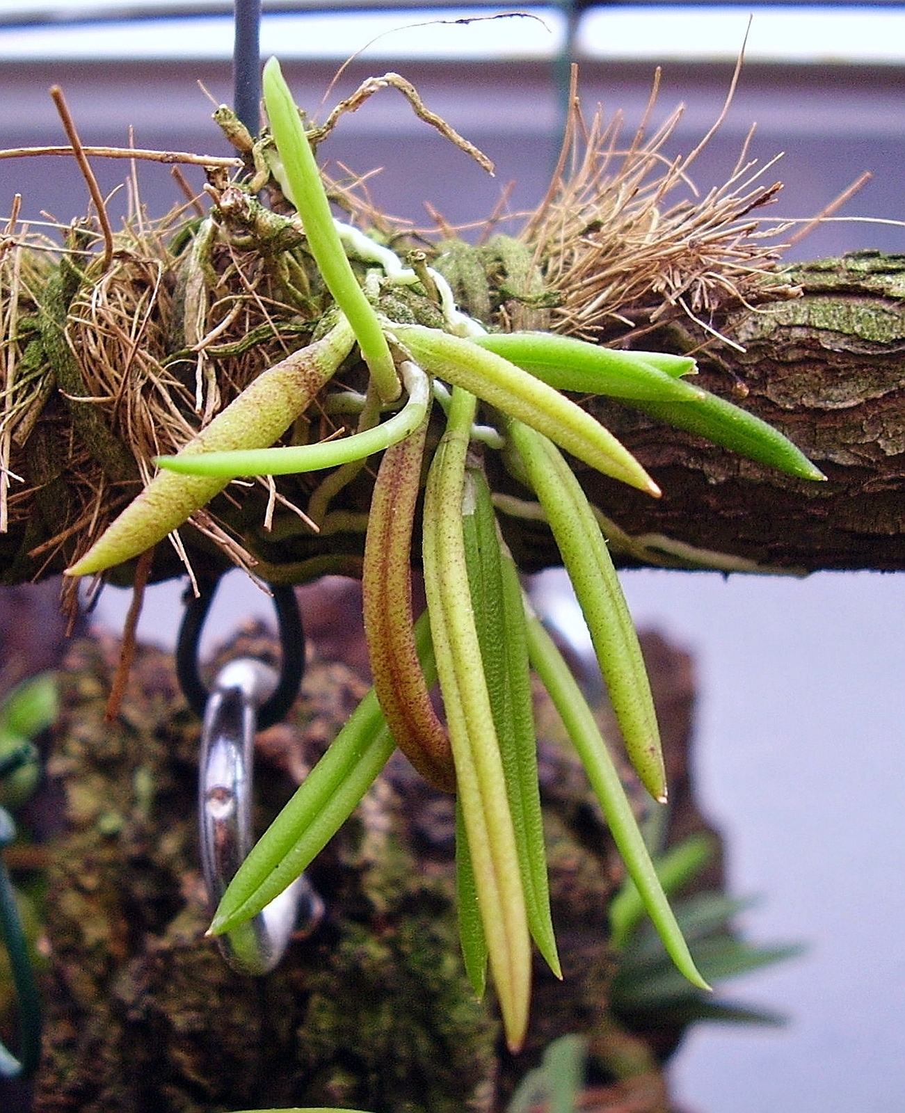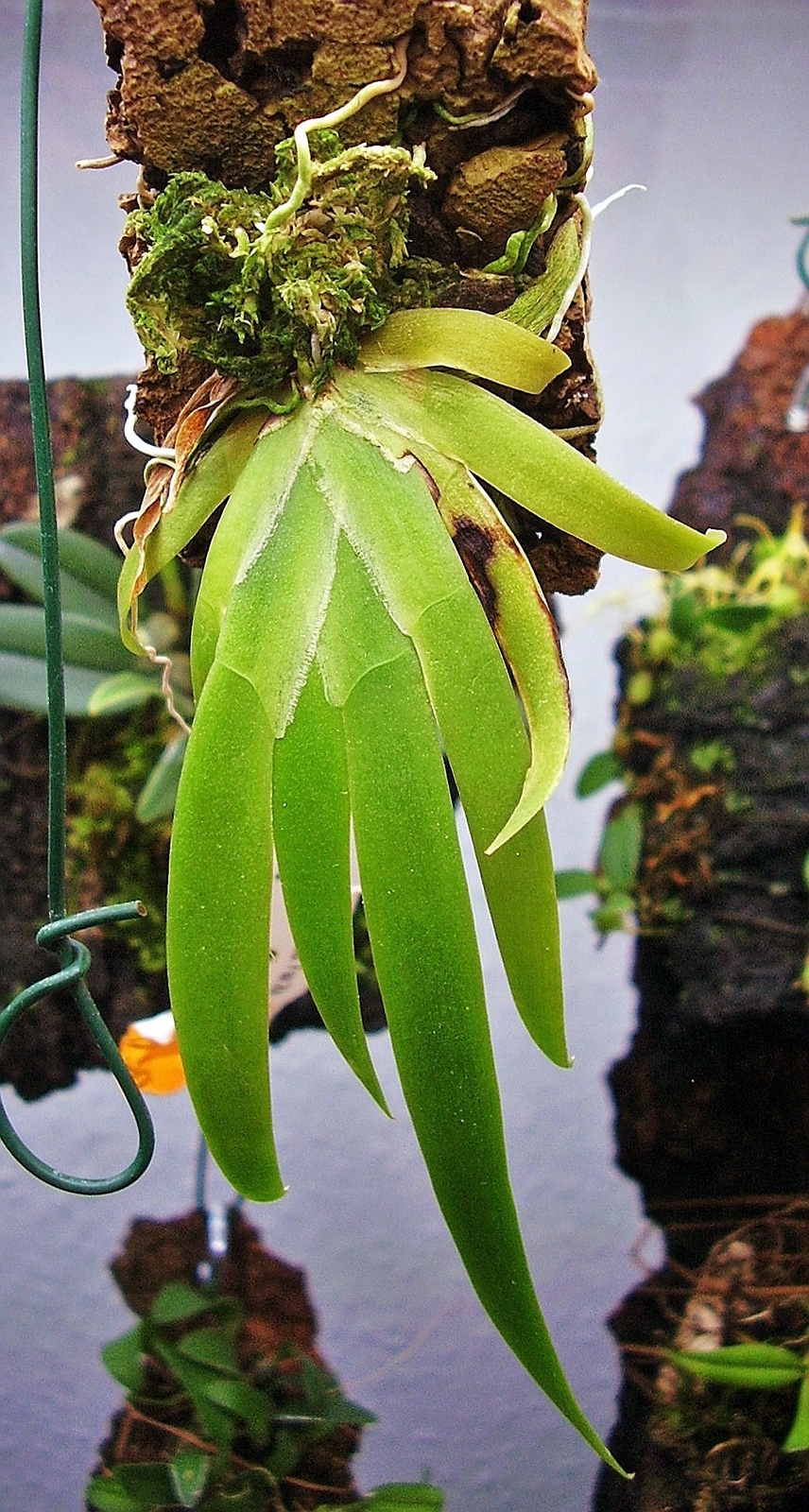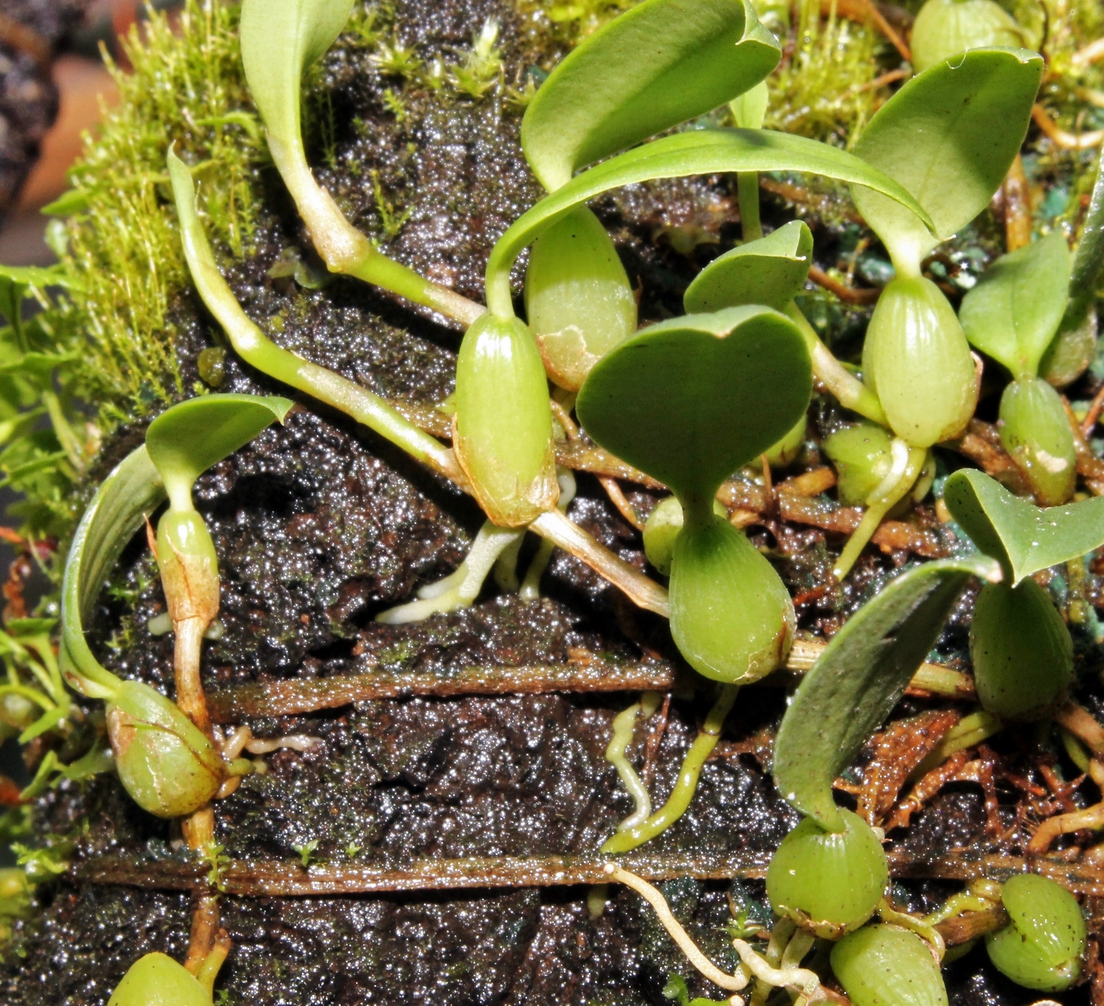 official&prmd=ivns&tbm=isch&tbo=u&source=univ&sa=X&ei=AApFTunyOsabOqyPnfAD&ved=0CEUQsAQ&biw=1366&bih=596]Stelis spec.[/url]: Die Pflanze habe ich bei uns in der Hamburger Gruppe vor ca. 5 Monaten bekommen. Nur ganz kurze Wurzelstümpfchen, dann 5 cm Stiel und oben drauf das Blatt, mehr nicht. Auf der Fensterbank wäre sowas nicht zu bewurzeln und auch bei mir hing die ganze Zeit nur das "Blatt" ohne einen Mucks zu machen in der Vitrine. Eigentlich hatte ich gehofft, das sie an der Basis wurzeln macht, aber dann wuchs oben an der Ansatzstelle zum Blatt der Trieb. Das machen die Pleurothallidinae sehr oft (z.B. Restrepia, Pleurothallis restrepioides). Jetzt wachsen die Wurzeln ins lebende Moos und der erste Trieb ist da.