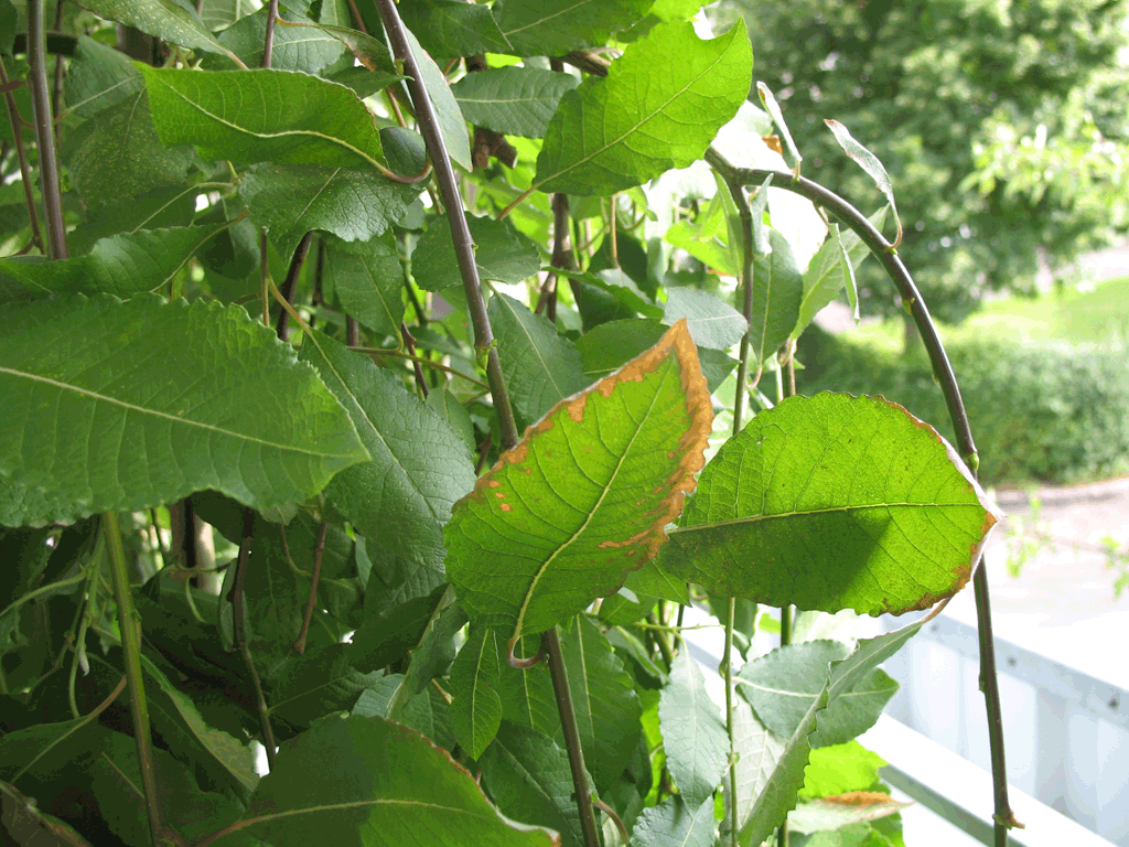 Zunächst dachte ich daran, sie seien von der Sonne verbrannt. Doch jetzt zeigt sich, dass die braunen Blätter zunehmen, ohne dass die Sonne überhaupt scheint.