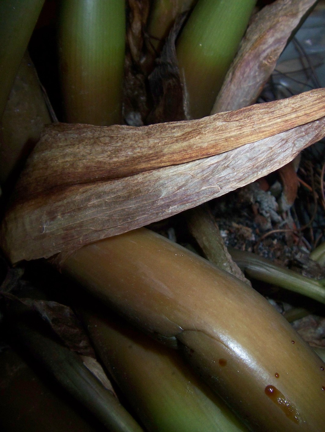 So, Topf war dann endlich weg und da stand sie nun in ihrer, hm, nein, nicht gerade ansehnlichen Pracht vor mir. Die Stiele (selbst die ganz dicken und eigentlich kräftigen) waren übrigens dann alle abgeknickt, waren zwar noch dran, aber nur ganz dünn, also man konnte die ganz locker hin und her bewegen, braun und naß waren sie dazu auch noch unten. Also hab ich erstmal die ganz schlechtesten abgeschnitten, in der Hoffnung, daß vielleicht wenigstens in der Mitte noch 1,2,3 Stiele halbwegs heile sind und ich die Zami umtopfen kann.