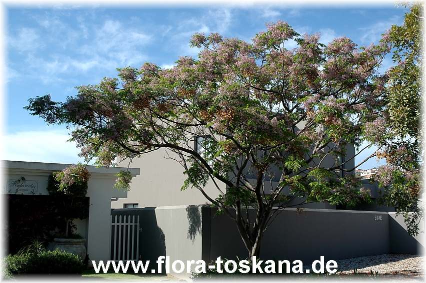 Hinweise: Paternosterbäume sind ausgesprochen genügsame Kübelpflanzen, die auch Pflegefehler nicht übel nehmen. In kalten Wintergärten ist er ein wertvoller, sommerlicher Schattenspender, der im Winter das Licht hereinlässt. Der Name rührt von den harten Samen her, die man früher zu Rosenkränzen verarbeitete.