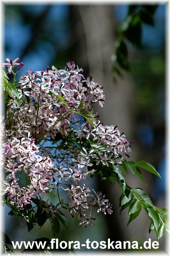 Schnitt: Melia wächst naturgemäß baumförmig. Zum Kronenaufbau kürzt man die Triebe mehrmals ein. Ältere Pflanzen schneidet man regelmäßig im Spätwinter in Form, indem man schwache Vorjahrestriebe herausnimmt oder einkürzt.
