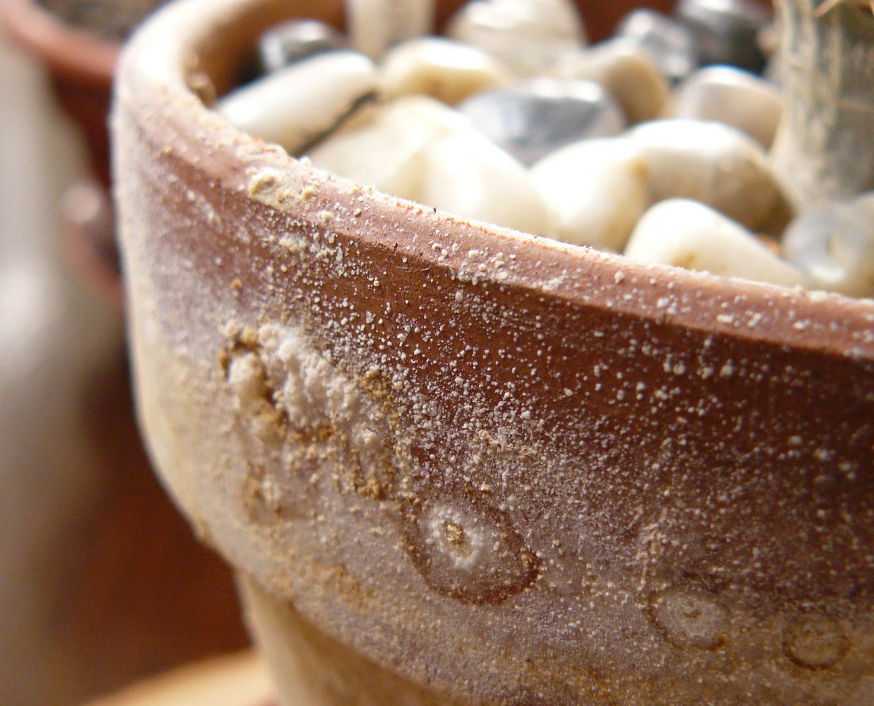 Seltsamerweise hat sich am Tontopf eine Art Schimmel gebildet. Komisch, denn die Pflanze steht im Wohnzimmer und wird eigentlich wenig gegossen.