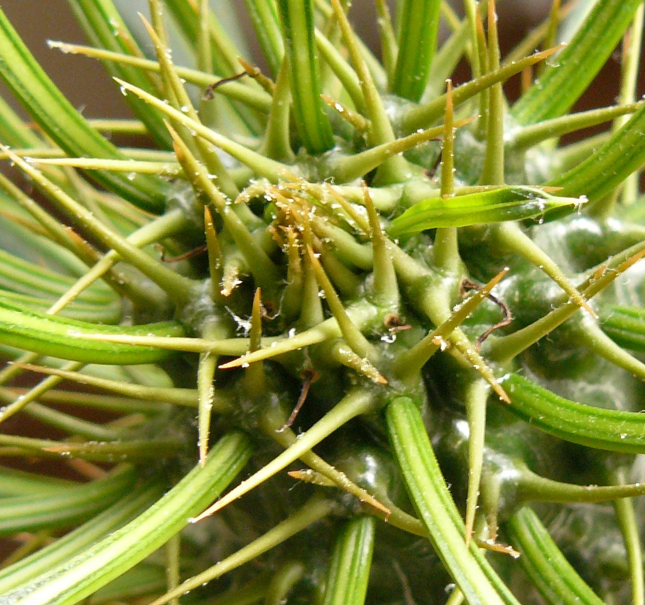 Habe eine Frage zu meinem Pachypodium lamerei bzw dem Topf in dem er lebt. Könnten die kleinen weissen Punkte auf der Pflanzenkrone Milben sein oder anderes Getier? Die Punkte verändern sich imho nicht - werden nicht mehr und scheinen immer auf gleicher Stelle zu sein. Vielleicht sind sie auch nur sehr langsam die Dinger