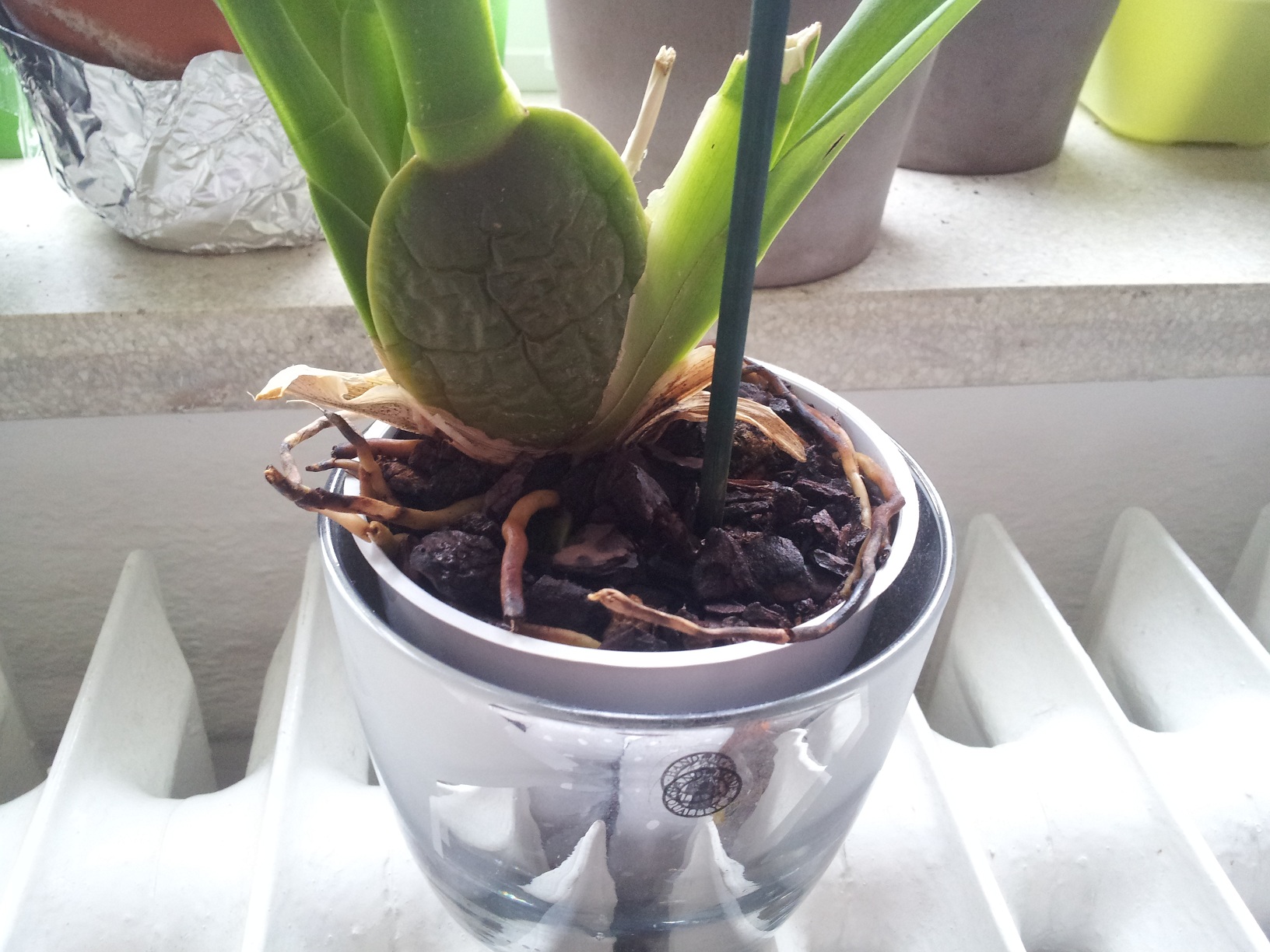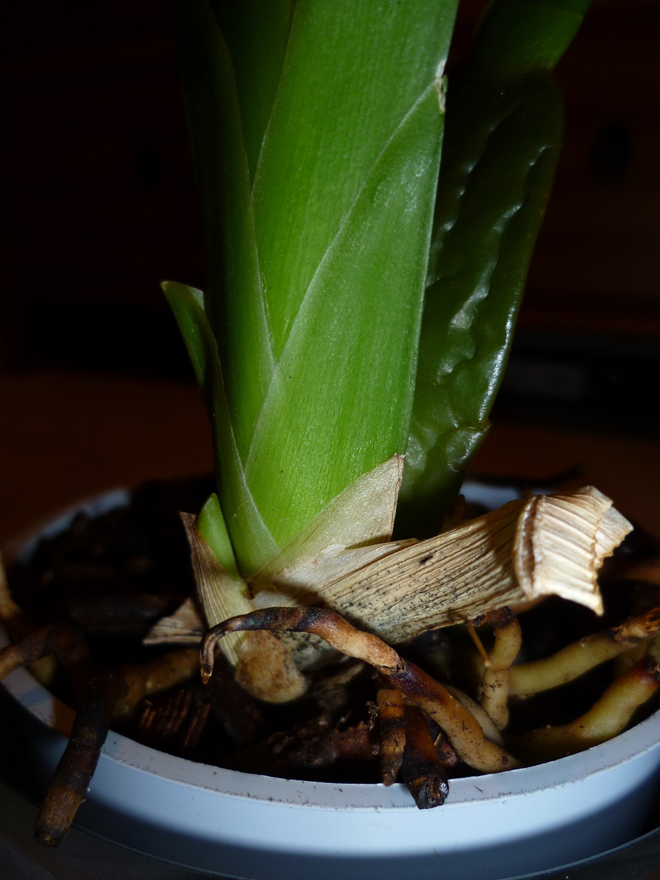 Dann hatte ich den Verdacht, dass sie vielleicht fault weil die Wurzeln, die oben aus dem Topf schauen ganz braun waren.