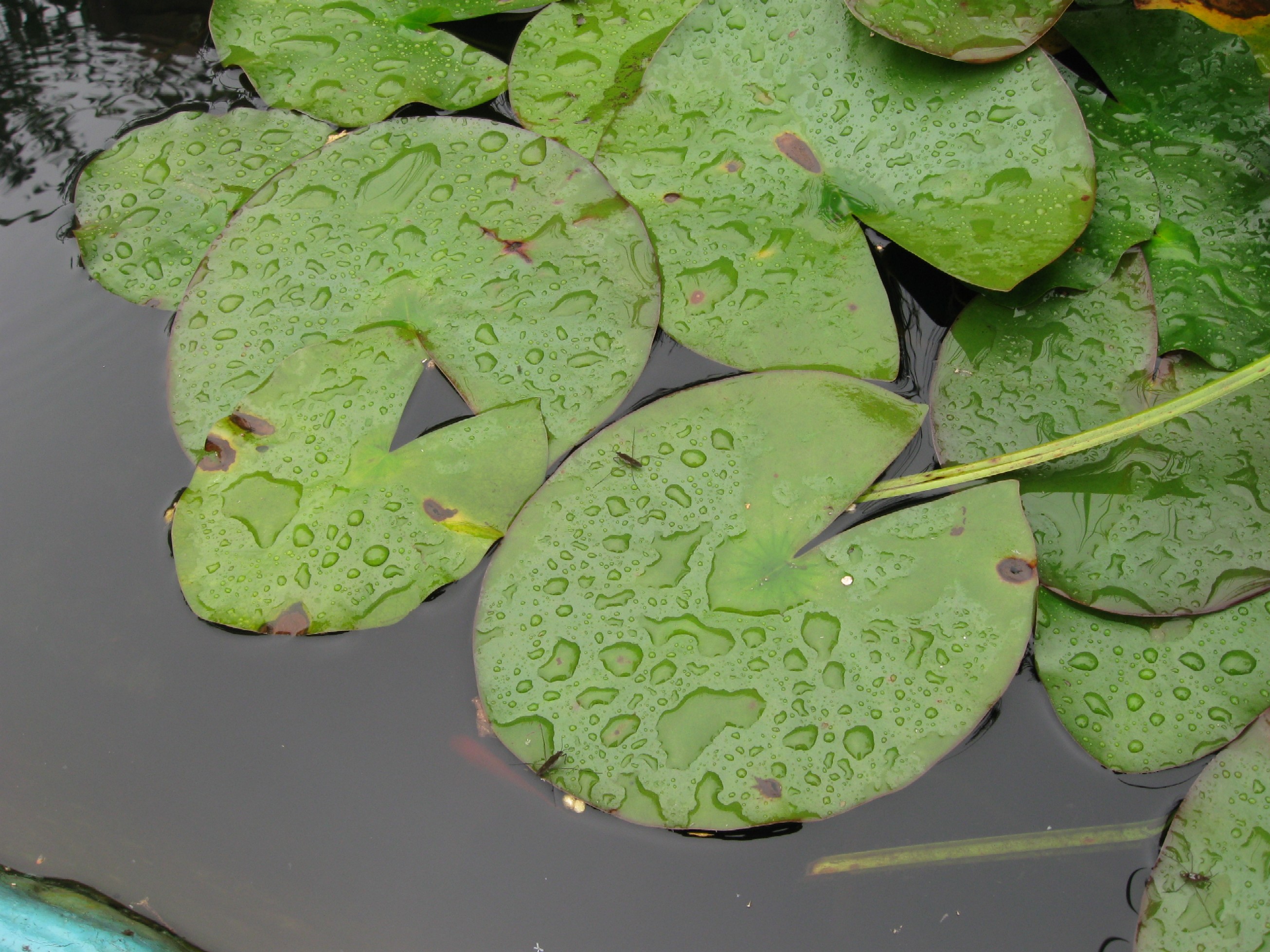 Also, so groß ist unsere Auswahl nicht. Wir haben 2 Teichrosen und 1 Minirohrkolben, die allerdings nicht geblüht haben; dann eine Wasserlilie und eine Dotterblume, gelb, die haben schön geblüht.