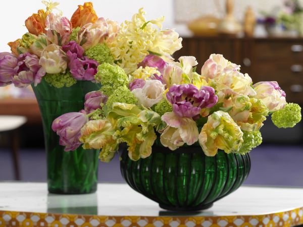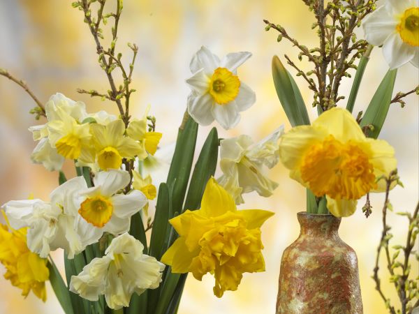 Die Wahl der passenden Vase wird nicht nur von praktischen Aspekten bestimmt, denn Form, Farbe und Material können die Ausstrahlung der Schnittblumen deutlich beeinflussen: Schlichte Glasvasen zum Beispiel heben die Schönheit der Blüten hervor, denn sie lenken nicht ab. Eine nostalgische Vase kann wichtiger Teil des Arrangements sein und so die Wirkung des Straußes vergrößern. Jede Blume wird zu einer Persönlichkeit, wenn verschiedene Frühblüher wie kostbare Sammlerstücke einzeln in kleinen Gläsern oder Flaschen arrangiert werden. Auch ohne floristische Kenntnisse bekommt ein Tulpen- oder Narzissenstrauß in einer großen Vase mit einigen Zweigen von knospigen, noch unbelaubten Gehölzen, zum Beispiel von Forsythien- oder Ranunkelsträuchern, eine ganz besondere Note. Für den Frühling in der Vase gibt es viele gestalterische Möglichkeiten, die keine besonderen Kenntnisse erfordern - am besten einfach mal ausprobieren und sich jetzt schon über den Frühling freuen.