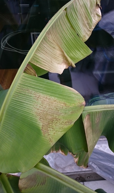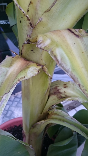 Dann fing ich mich an zu kümmern....Als ich eines Abends nach Hause kam hat die Pflanze unglaublich stark gerochen. Es war ein wirklich eckliger modriger Geruch es roch nach Schweiß irgendwie. Daraufhin stellte ich Sie raus auf den Balkon, da das echt furchtbar war Temperaturen draußen um die 20 Grad. Ich goss sie regelmäßig und dann fingen die Blätter am Stamm an so braune Punkte zu bekommen....dann wurde es kälter und ich habe Sie nicht rein gestellt wegen dieses penetranten Geruchs (ich konnte nirgends etwas im Internet darüber finden). Die Blätter haben durch direkte Sonne dann leider einige Sonnenbrandstellen abbekommen. Und naja dann war ich im Urlaub und vergaß sie reinzustellen. Ich kam paar Tage später zurück und die Pflanza sieht nicht sehr gesund aus....Auf den Fotos kann man das Ergebniss meiner Vergesslichkeit sehen. Was die Blätterfarben betrifft so habe ich herausfinden können dies sind vermutlich Erfrierungen und teilweise Sonnenbrand. Spinnmilben und andere Tierchen konnte ich nicht entdecken. Was aber sind diese Punkte am Stamm und diese rötliche Farbe unten....ZUsätzlich ist die Spitze die aus der Mitte wächst auch bräunlich jedoc nicht an allen Stellen. Was kann ich nun tun? Komplett runterschneiden oder nur die Kaputten Blätter und vor allem wie mache ich das? Und noch eine Frage. Was für Erde ist für solche Bananenpflanzen die geeignetste? Danke schonmal im Voraus für eure Hilfe.