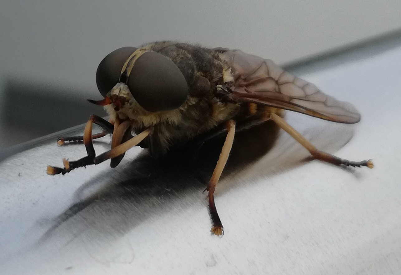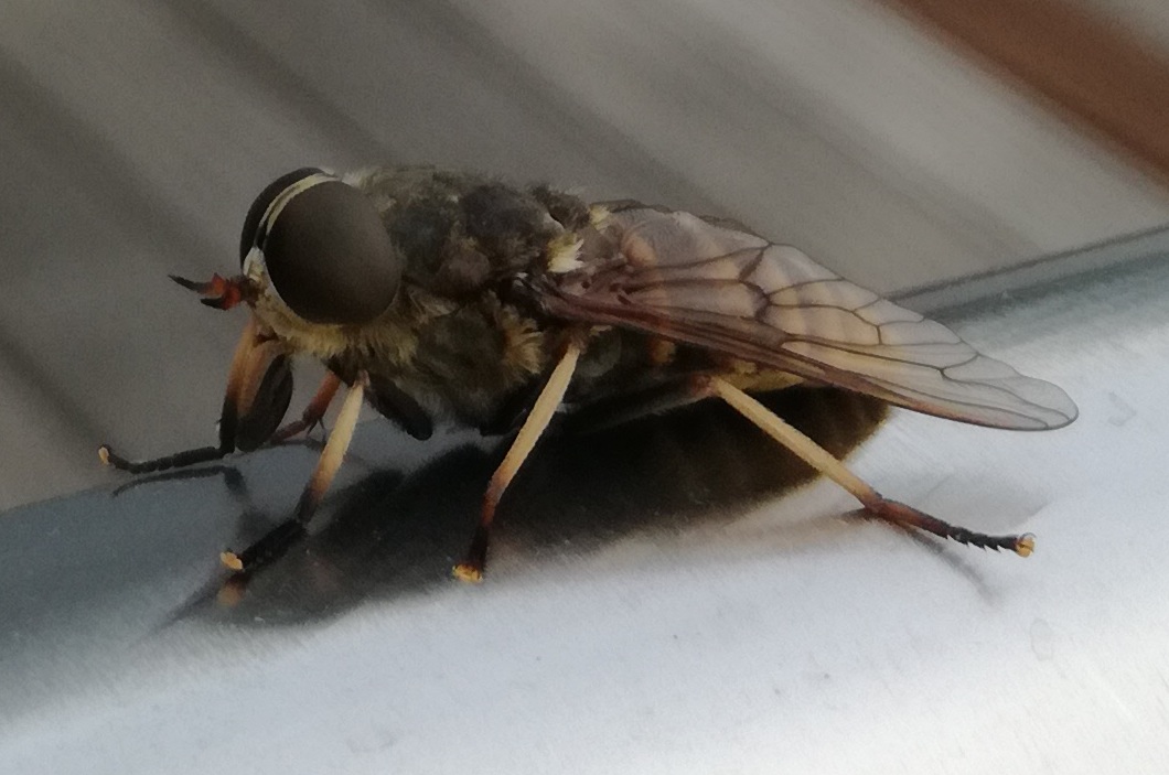 Schaut Euch mal die beiden Fotos an. Das ist scheinbar eine Fliege aber bei der geschätzten Größe von ca. 3cm Körperlänge (ohne Beine/Flügel) ist das wohl eher ein Monster. Jedenfalls habe ich so ein "Biest" noch nie vorher gesehen.