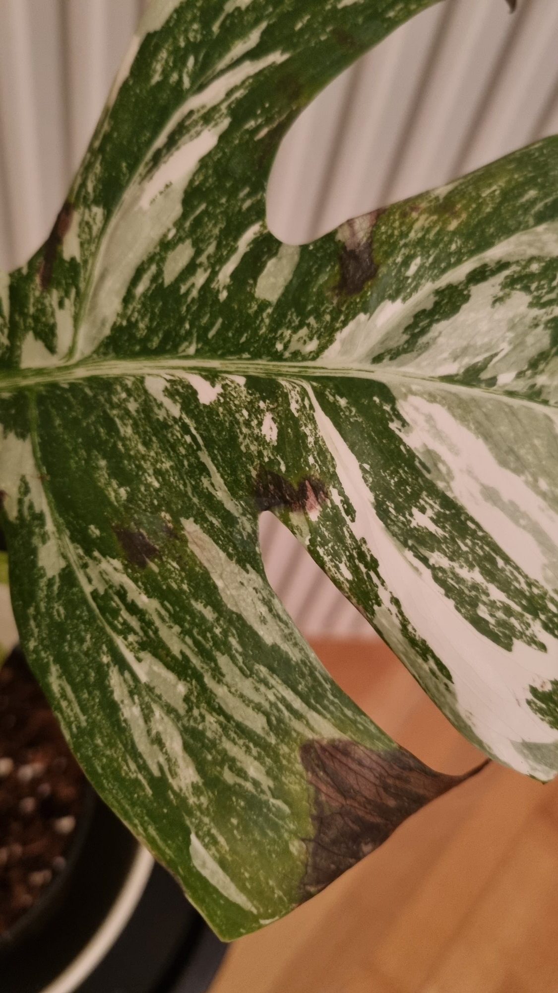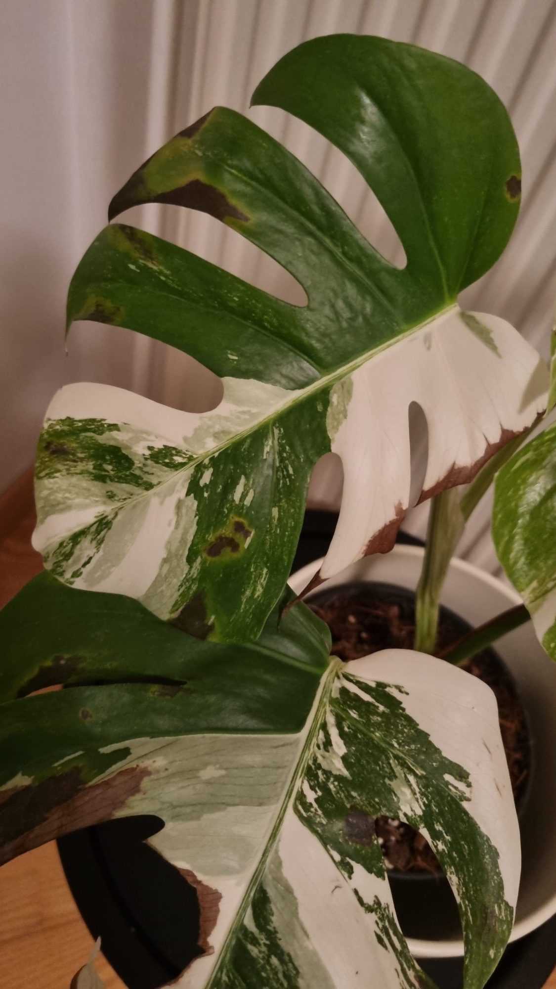 Die defekten (weissen) Blattpartien sind bekannt dafür, nicht gerade robust zu sein und sehr schnell abzusterben (dunkelbraun). Welche Bedingungen dazu führen, weiss vermutlich niemand so genau. Lichtmenge, Wasser- und Nährstoffversorgung, Temperatur, Luftfeuchtigkeit sollten möglichst ideal sein, wobei sich die Frage stellt, was ideal bedeutet und ob dies in einem Wohnraum zu erreichen ist.