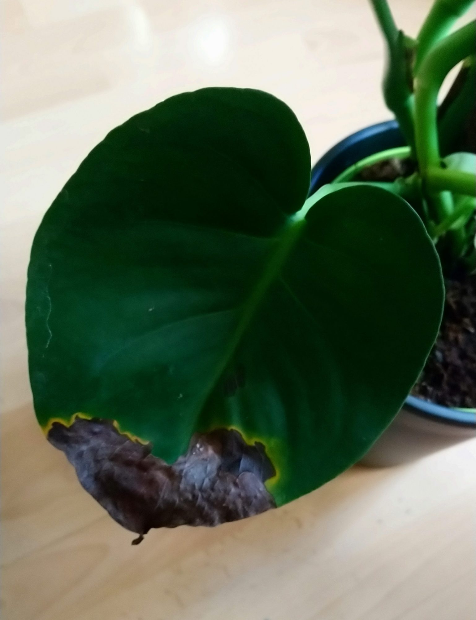 Ich ging zunächst davon aus, dass ich vielleicht doch einmal zu viel gegossen hatte und daher die Braunfärbung einsetzte, die zunächst 3 oder 4 Blätter (alt und jung) betraf. Nach einer Weile habe ich dir betroffenen Blätter abgeschnitten.