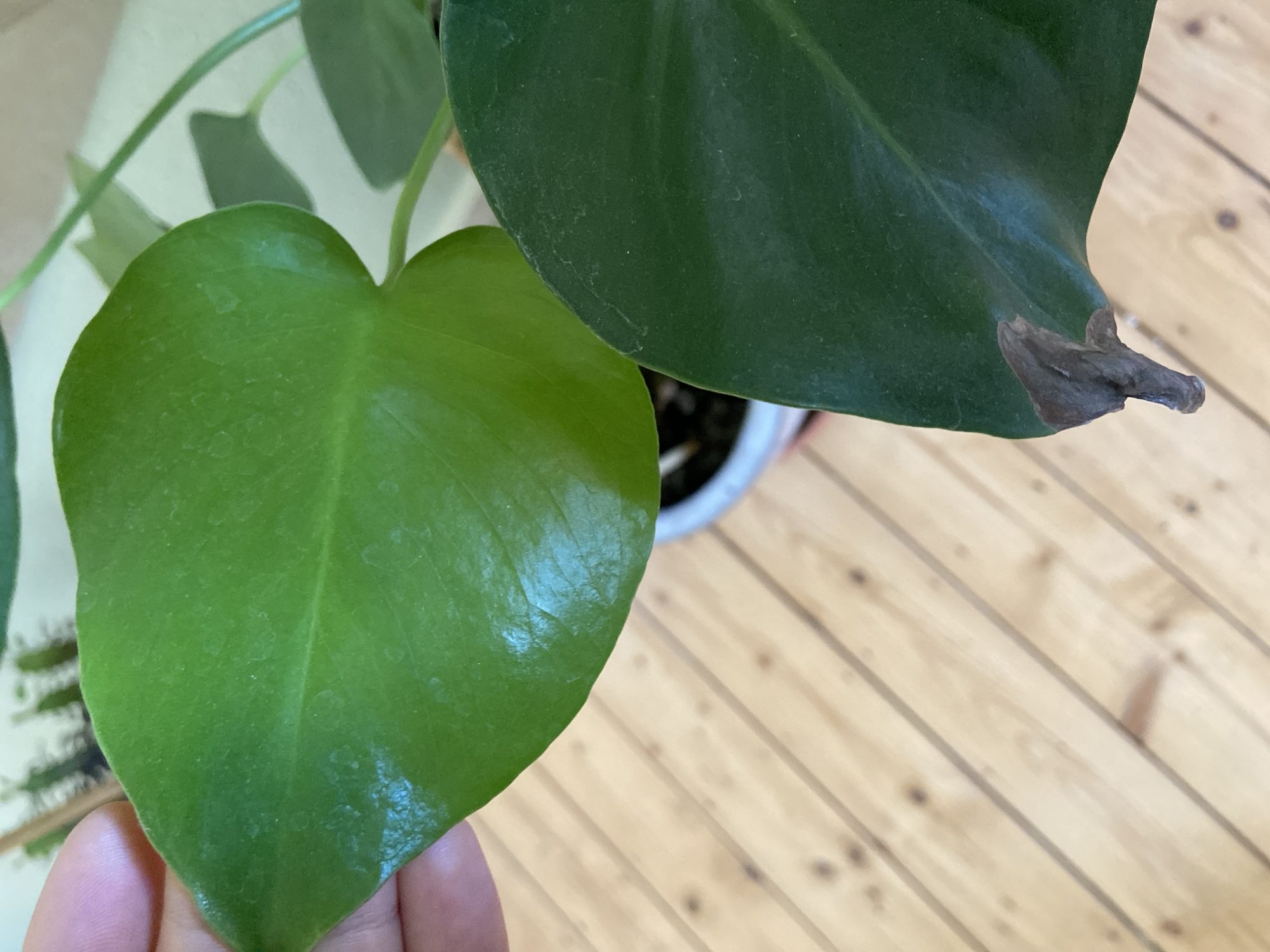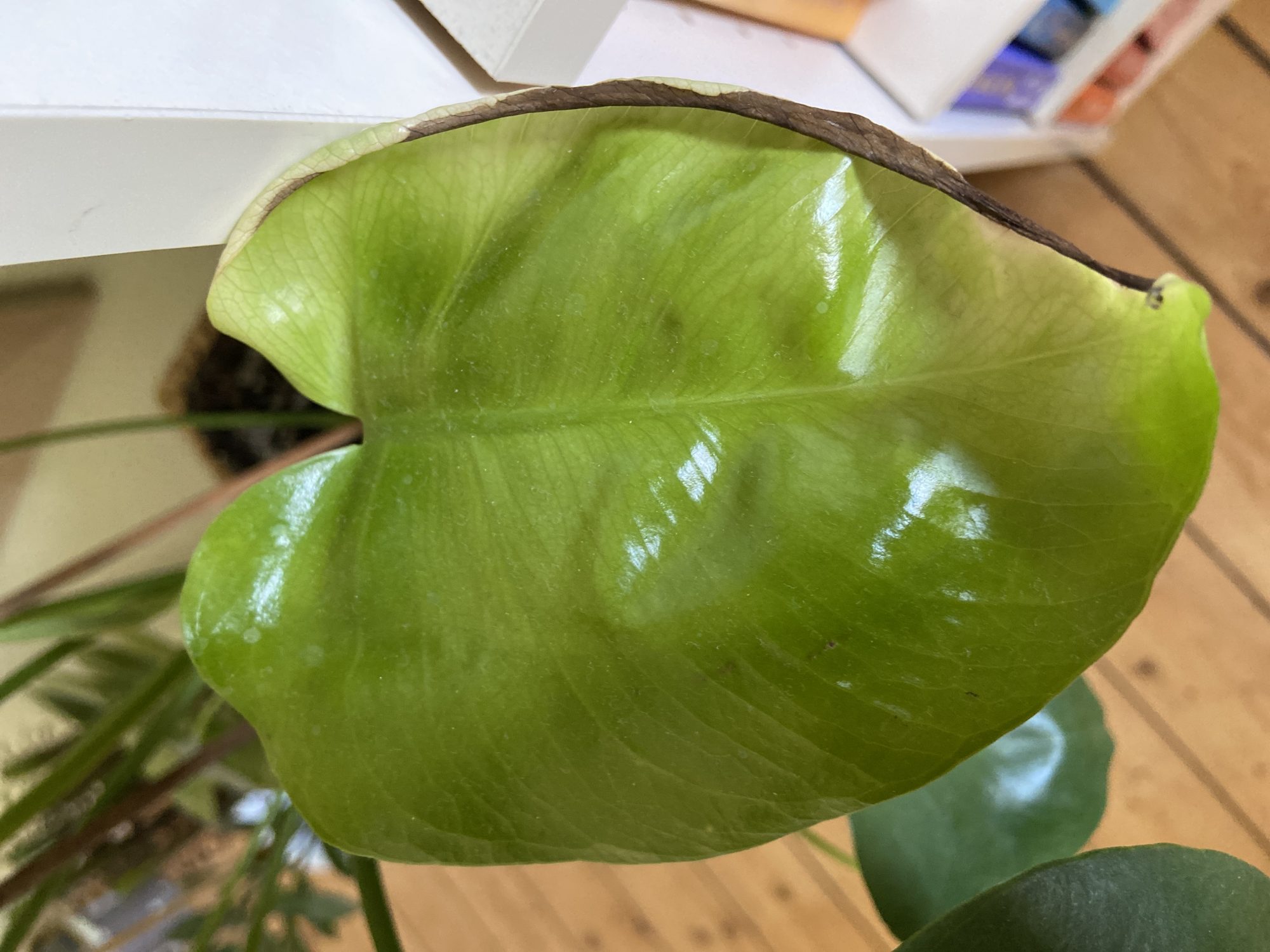 Ich habe eine Frage, und zwar hat meine geliebte Monstera zwei neue Blätter die mir Sorge bereiten. Sie sind schwach, blass bis gelblich und haben diese braunen Ränder, noch während sie halb eingerollt sind, siehe Foto.