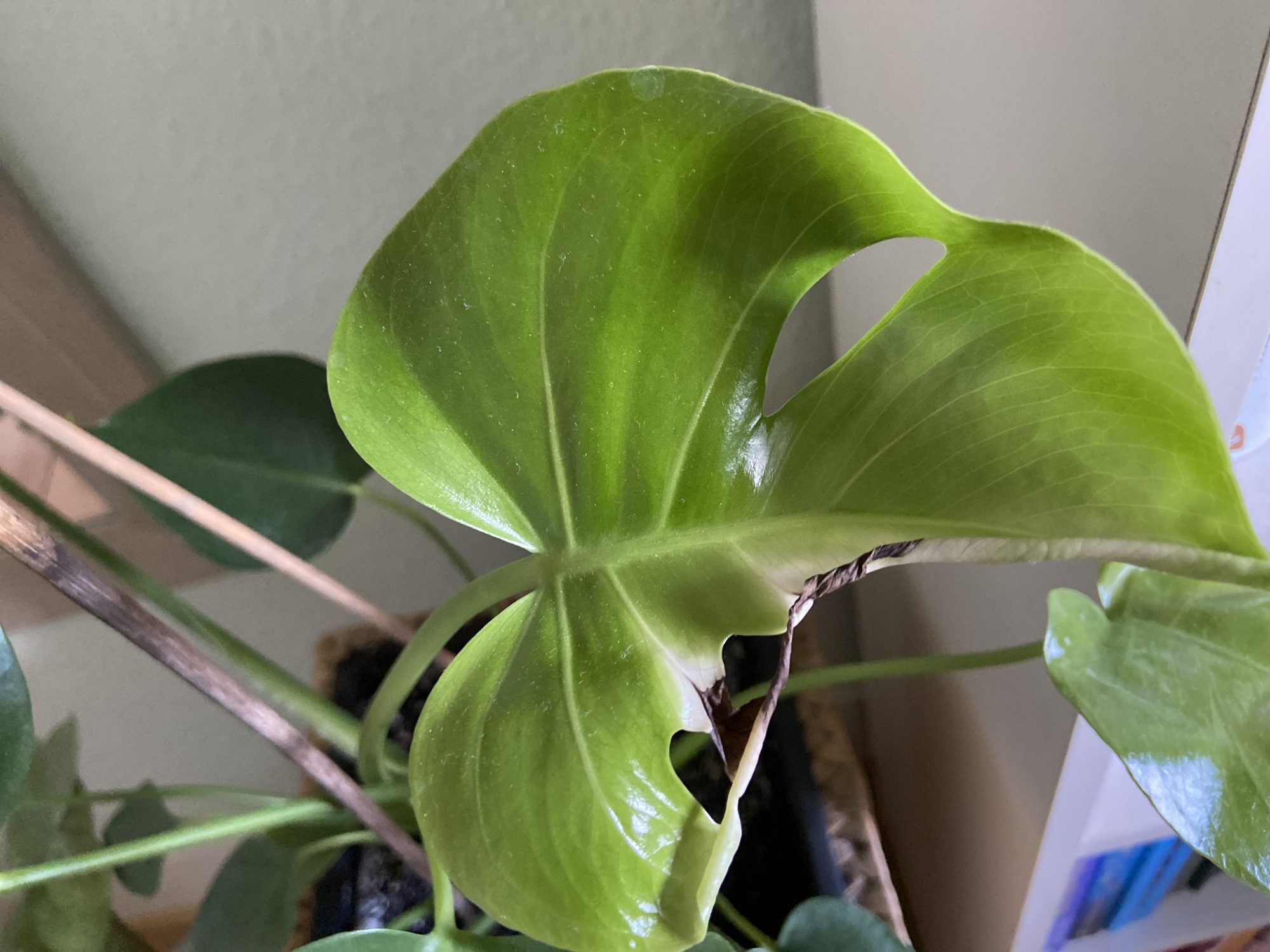 Ich habe eine Frage, und zwar hat meine geliebte Monstera zwei neue Blätter die mir Sorge bereiten. Sie sind schwach, blass bis gelblich und haben diese braunen Ränder, noch während sie halb eingerollt sind, siehe Foto.