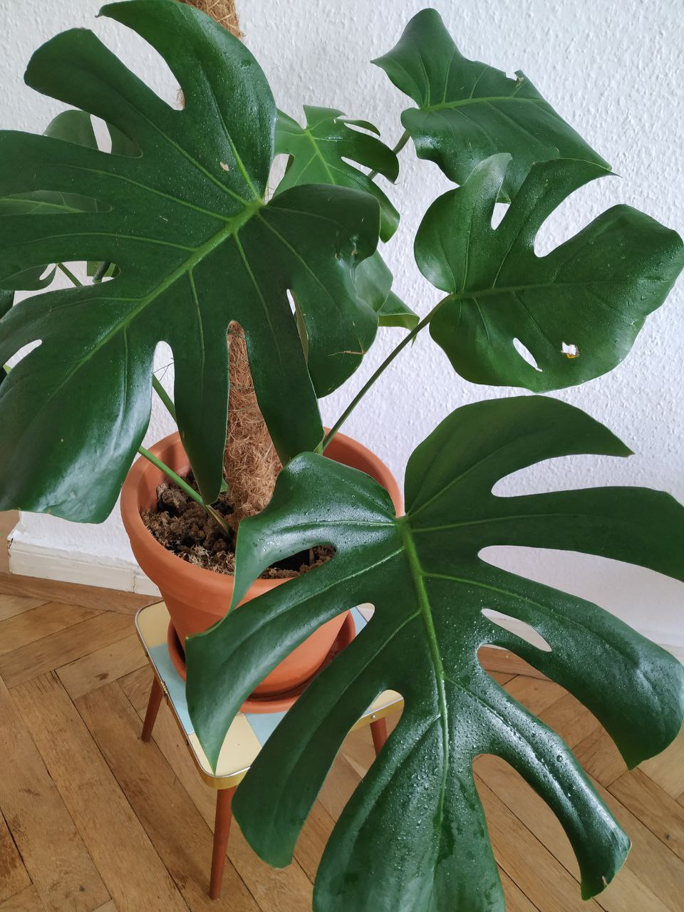 ich habe eine Frage zu meiner Monstera Deliciosa. Ich habe sie im Juli 2020 gekauft, und seitdem steht sie an einem Nordwestfenster und bekommt viel indirektes Licht ab. Die Blätter sehen gut aus, allerdings hat sie in der gesamten Zeit nur ein neues Blatt nachgeschoben, und Luftwurzeln bildet sie gar keine. Auch sind an den bisherigen Blättern die Ansätze neuer Blätter zu sehen, es geht aber auch dort nicht weiter mit dem Wachstum. Heute habe ich sie mal wieder gegossen mit einer Mischung aus destilliertem Wasser und Leitungswasser, wobei ich Wasser von oben als auch über den Untersetzer hinzugegeben habe, weil ich sonst den Wurzelballen nicht richtig feucht bekomme. Beim Anheben habe ich eine fette Wurzel gefunden, die sich ihren Weg aus dem Topfloch bahnt. Anscheinend wurzelt die Monstera sehr stark, aber die Blätter wachsen nicht. Was kann bzw. sollte ich tun? Umtopfen?