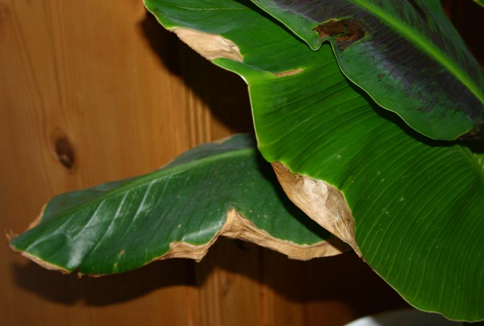 Aber jetzt erstmal zu meinem Problem - seit drei Wochen, nach meinem Umzug, steht die Pflanze an einem Südwestfenster und hat bei den drei neu gebildeten Blättern jeweils braune Ränder und Flecken schon vor dem "Ausrollen" aus dem Pseudostamminnneren gebildet. Die andere 'dwarf cavendish' die keine 2 Meter daneben steht macht keine Probleme.
