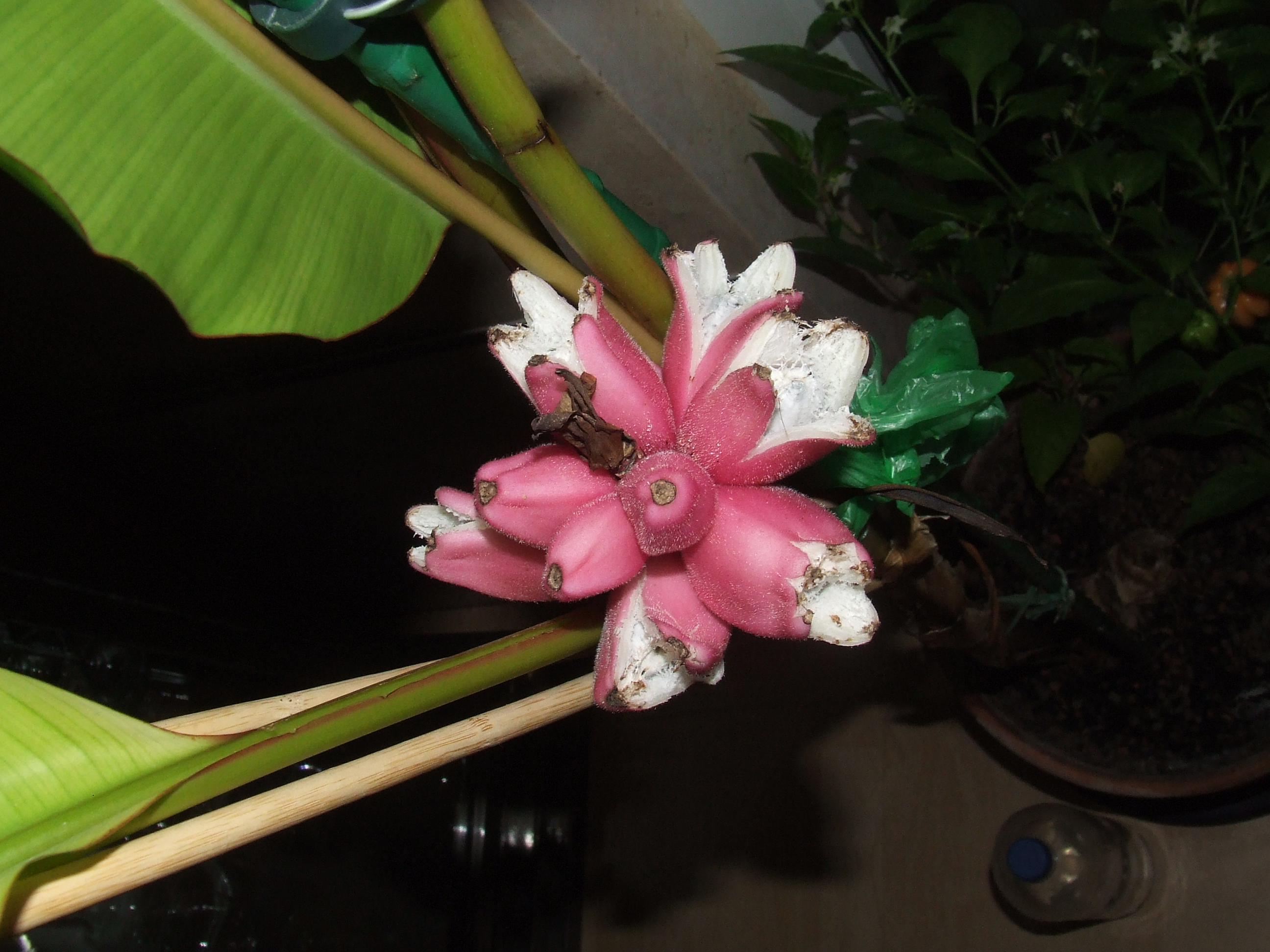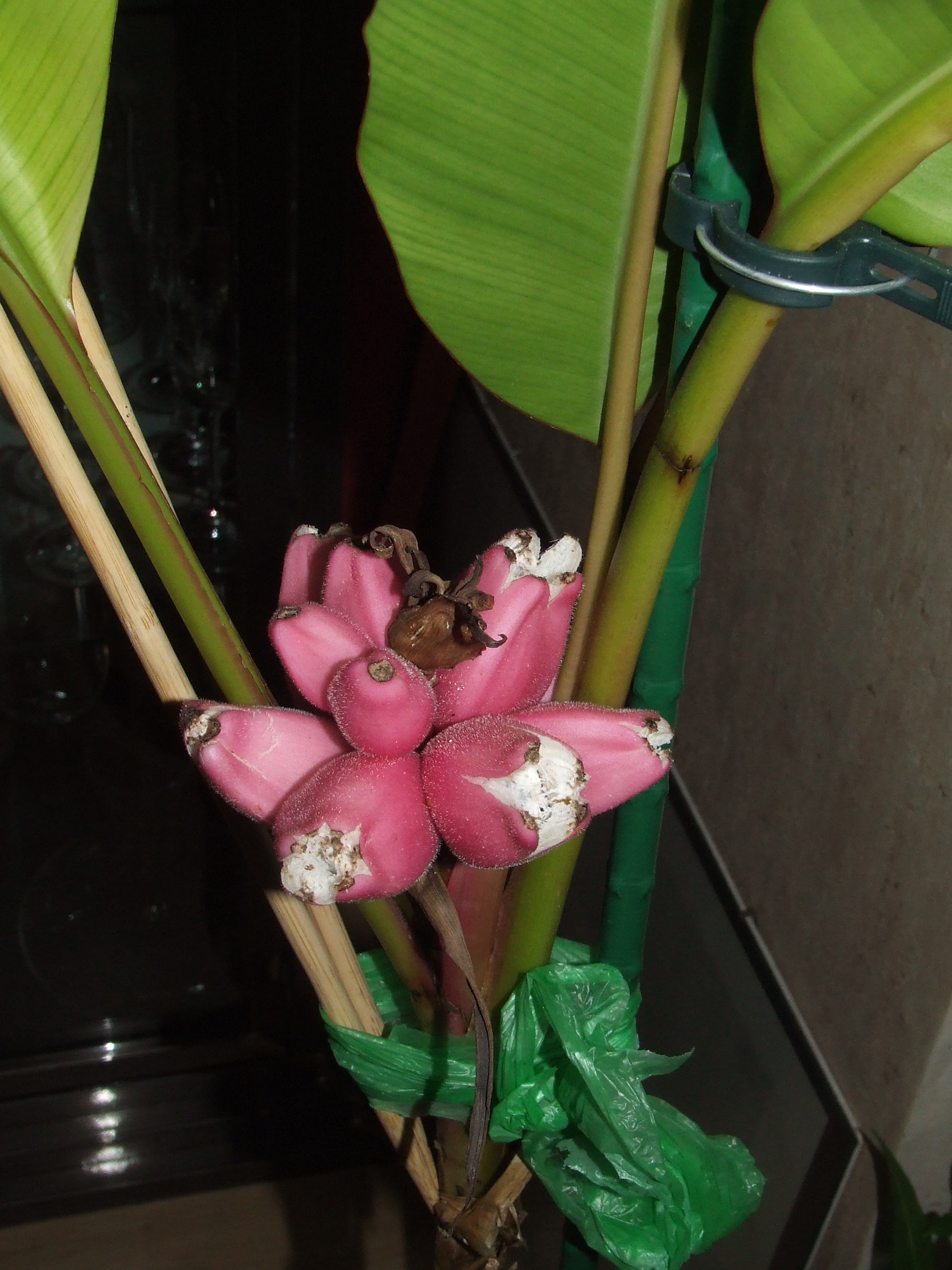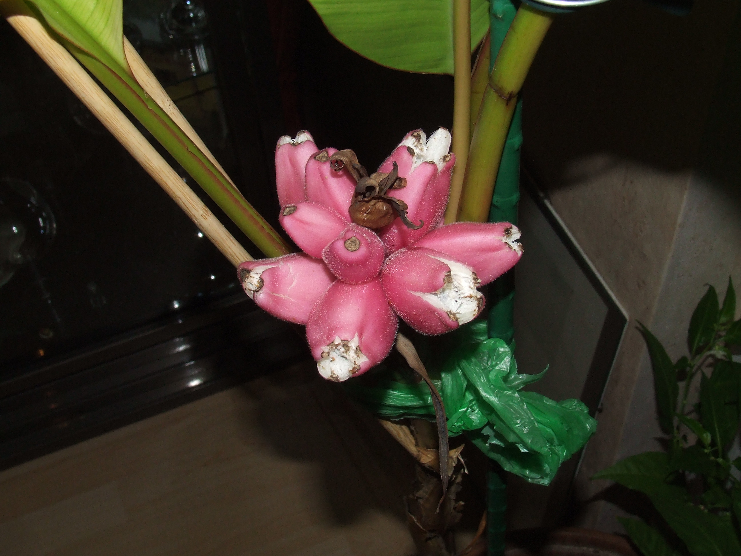 Erfreue dich an der Blüte und den kleinen rosa Bananen die sehr viele keimfähige Samen tragen werden.