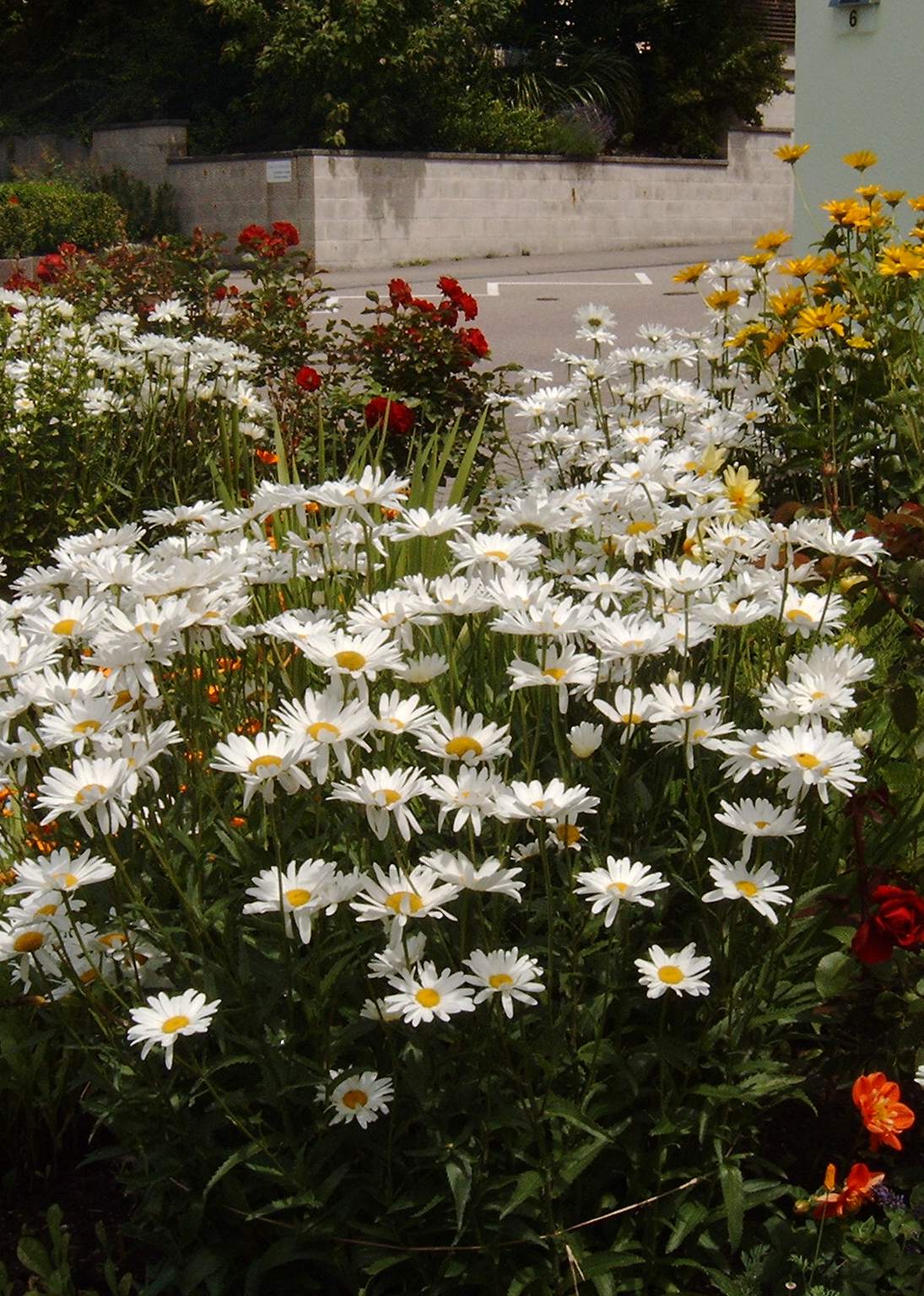 Bei den teilbaren Pflanzen, da hätte ich wohl eher was abzugeben - aber im Moment auch nur eine Art, nämlich die große Gartenmargarite (Leucanthemum maximum). Davon hätte ich aber jede Menge abzugeben, gerne auch gleich 'ne große Staude am Stück - müßte man halt noch klären, wie man den Versand gestaltet. Die Gartenmargarite hat große weiße Blüten (ca. 8 cm im Durchmesser), wird zwischen 80 und 100 cm hoch. Sie eignet sich auch sehr gut als Schnittblume.