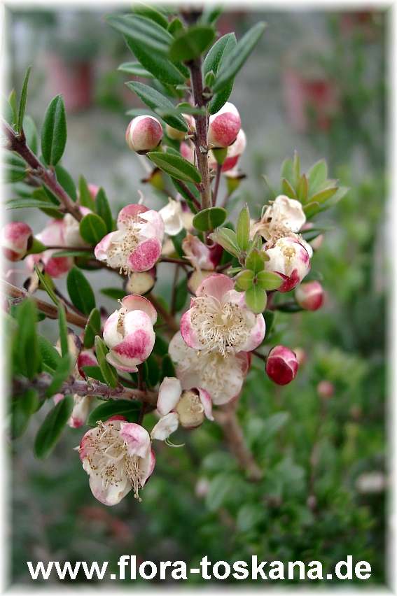 `Variegata´: buntblättrige Myrten-Sorte mit cremeweiß-grüner Panaschierung und ebenfalls weißen Blüten