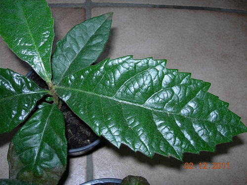 Blätter sind wechselständig, elliptisch, doppelt gesägt, fein behaart und kräftig dunkelgrün.
