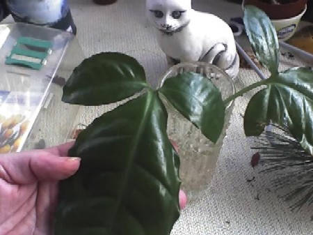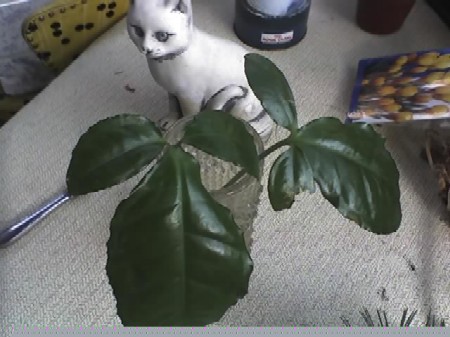 sicher könnt Ihr mir helfen. Habe diesen Ableger von einer Freundin erhalten und weiß jetzt nicht, um welche Pflanze es sich handeln könnte. Es heißt nur, daß sie ziemlich groß werden könnte. Meine Freundin weiß auch nichts genaueres - hat den Ableger selber geschenkt gekriegt. Aber wie man am rechten Blatt sieht, hat sie ihrer Katze geschmeckt.