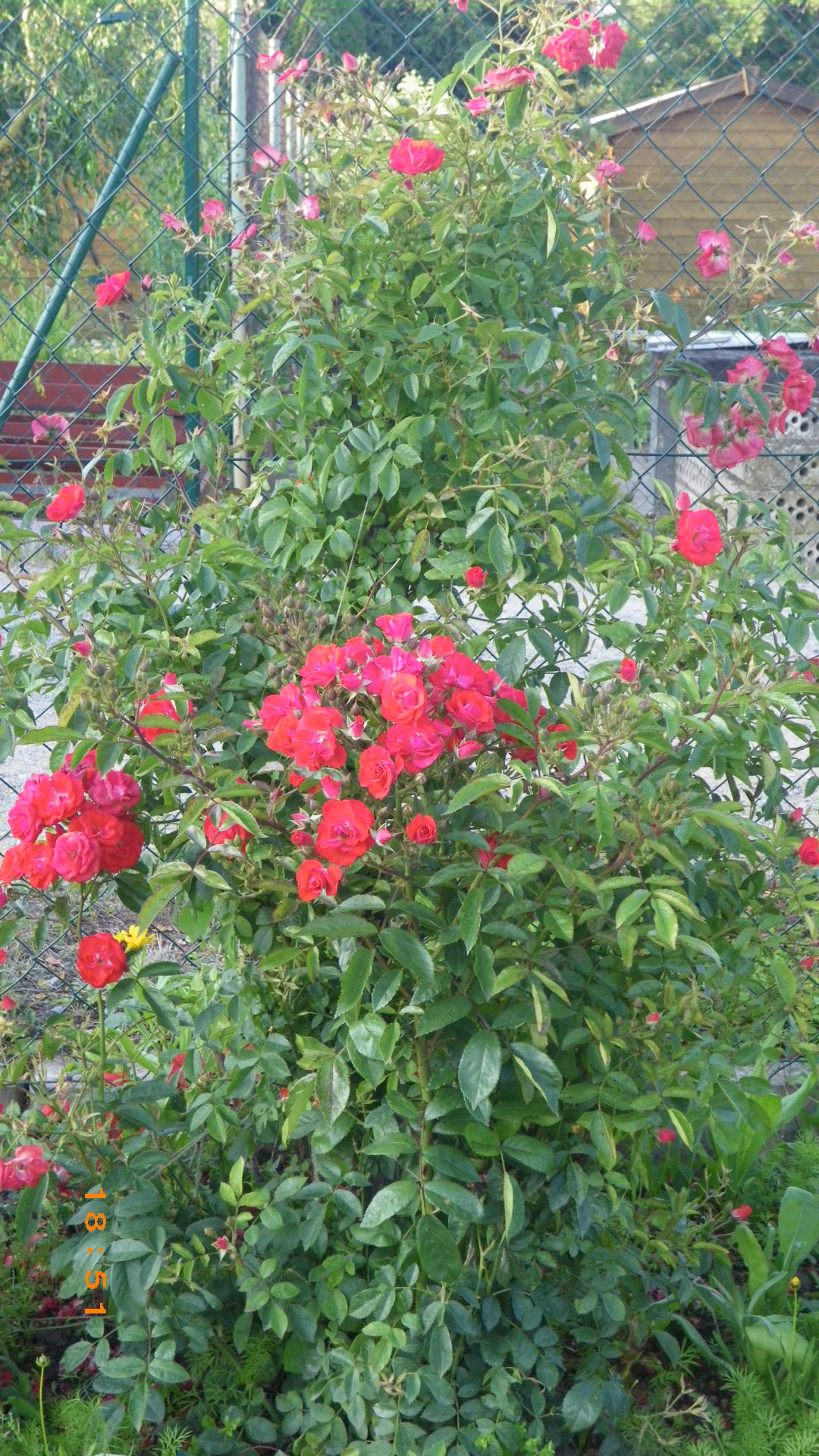 Dann habe ich noch diese Rose vom Vorgänger, Wächst sehr sehr buschig und ist sehr verzweigt. Mittlweile hat sie eine Höhe von ca.160 cm wenn nicht höher. Im Mai hatte sie mehr blüten als Blätter, jetzt hat sie etwas nachgelassen aber bildet neue knospen. Duftet nicht, hat eine stechend rote einfach gefüllte Blüten. Ist das eine Strauchrose (ulmermünster?) oder eine Kletterrose?!?
