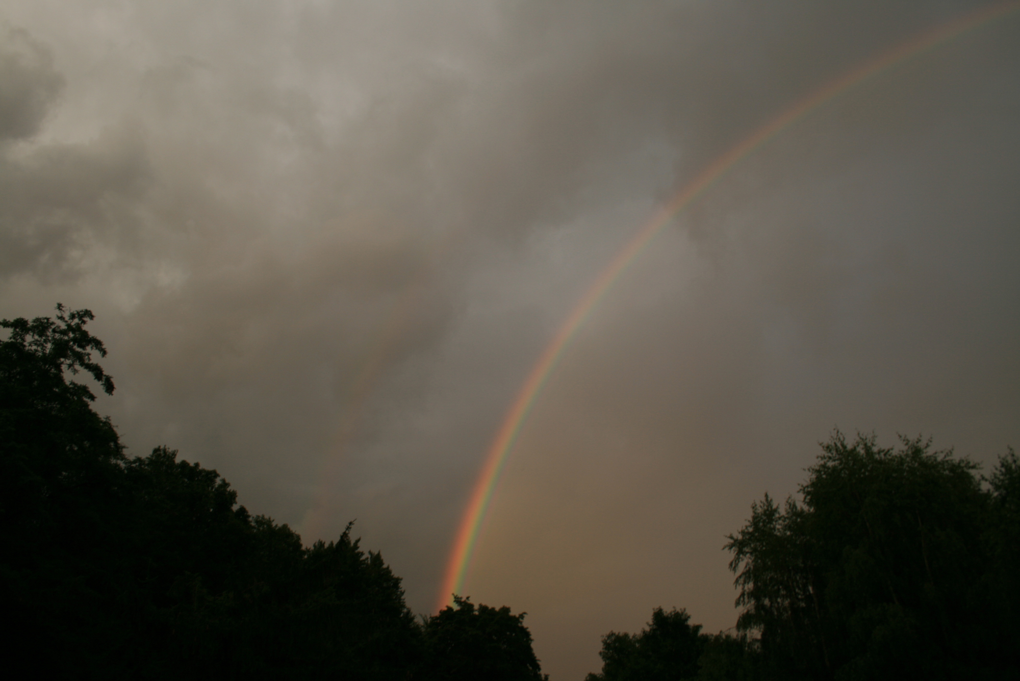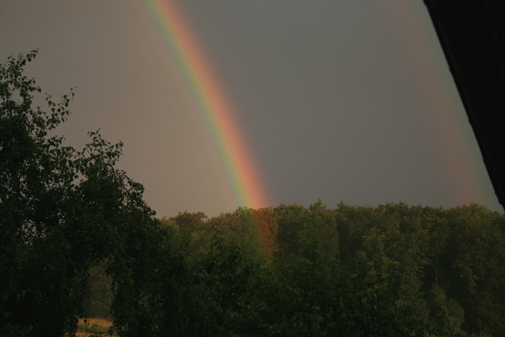 Das habe ich gerade Fotografiert ist doch ein Schauspiel der Natur.Einfach wunderschön.Wenn ihr genau hinschaut , seht ihr rechts einen zweiten Regenbogen . Ich bin immer wieder erstaunt wie die Natur so etwas zu Stande bringt.