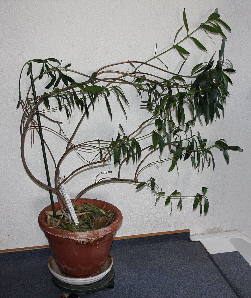 Habe mir vor vielen Jahren einen Oleander-Steckling aus dem Urlaub mitgebracht. Leider habe ich mich nie um eine Formgebung gekümmert, die Stütze kam zu spät, so daß nun dieses bogig gewachsene Exemplar herausgekommen ist. Hat jemand einen Vorschlag, was ich tun kann, damit er etwas ansehnlicher wird? Kompostieren ist übrigens keine Option!