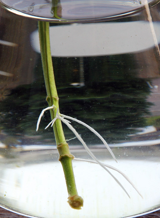 Bei diesen Zwergen habe ich es mir nicht aufgeschrieben, aber ich habe noch drei verholzte Triebe in Wasser gestellt, und zwar war das am 26.2. An denen tut sich noch nicht viel, aus den Lentizellen gucken so ca. 2 mm lange Gebilde raus, aber ob das Wurzeln werden wollen, wissen sie anscheinend selbst noch nicht. Die beiden hier gezeigten grünen Triebe habe ich vielleicht am selben Tag abgeschnitten, jedenfalls nicht früher. Somit wären das 2 Wochen und 2 Tage.