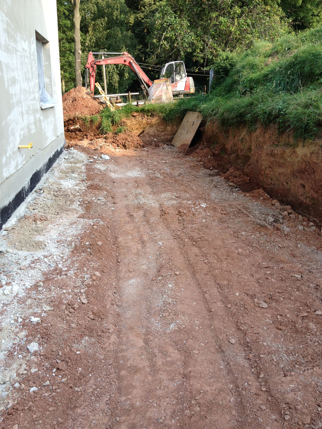 Die letzten 3 Bilder zeigen noch einmal den Bereich hinter dem Haus, dort werden noch ca. 20cm Frostschutz aufgefüllt. Man erkennt, dass wir hinten schon etwas "tief" sitzen.