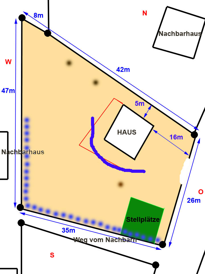 Bild 1 zeigt einmal das Grundstück, es befinden sich 3 Bäume auf dem Grundstück (ein auf dem Stellplatz befindlicher BAum wird noch gefällt), die roten Linien zeigen den Bereich, der noch mit Frostschutz ca. 20cm aufgefüllt wird, da dort irgendwie einmal ein Weg ums Haus bzw. die Terrasse entstehen soll. Man erkennt auf dem Bild, wo die Nachbarhäuser sind. Wir wollen auf jeden Fall Richtung Süden bzw. Süd-Westen etwas blickdichtes zum Nachbarn, am besten ein paar Koniferen (als blaue Punkte eingezeichnet), dahinter dachten wir dort vielleicht an eine Ecke mit vielen Obstbäumen, da dies eh der höchste Bereich vom Grundstück ist.