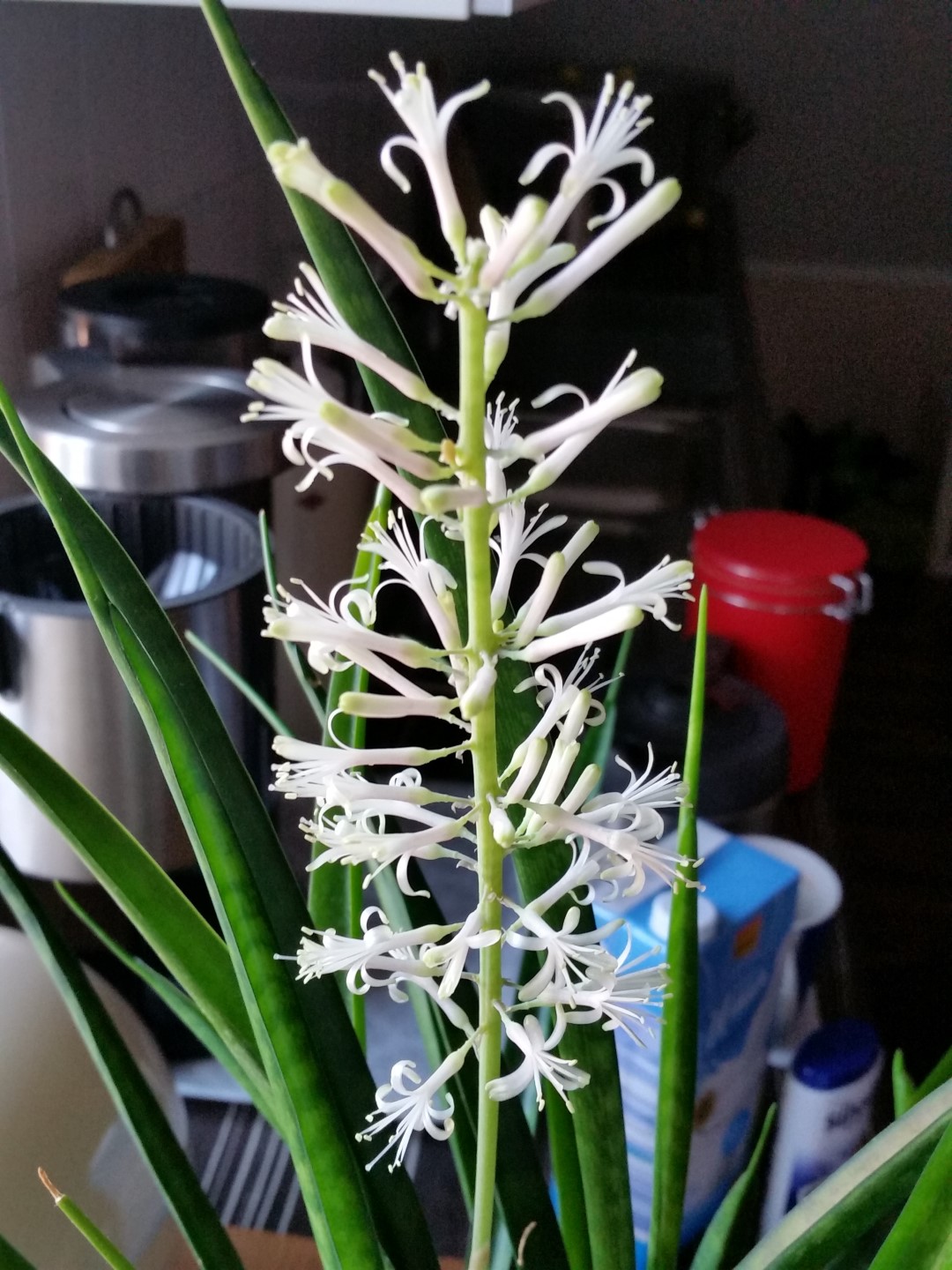 Der Name S. kirkii Friends ist ein Fantasiename und dient nur dem Verkauf. Die echte S. kirkii blüht mit einem fast handballgroßen kugeligen Blütenstand: "http://commons.wikimedia.org/wiki/File:Sansevieria_kirkii_-_inflorescences_%285648845552%29.jpg"