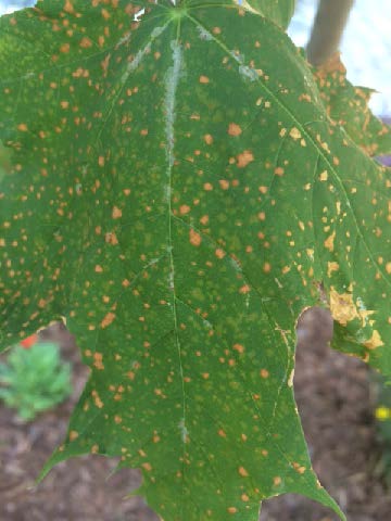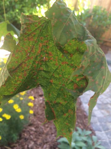 Anfänglich hatte der Kugel-Ahorn leichten Mehltau, der ist jetzt weg, aber die Blätter haben rot/braune kleine Punkte und die Ränder drehen sich ein und vertrocknen am Rand.