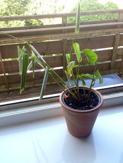 Die Korbmarante steht nun im Badezimmer am Westfenster, wo sie sich offensichtlich wohler fühlt. Die Blätter sind nicht mehr so stark eingerollt und sie wächst auch besser, was wohl an der Luftfeuchtigkeit liegt. Leider ist im Bad die Fensterbank sehr schmal und es ist gerade soviel Platz das der Topf nicht runterfällt.