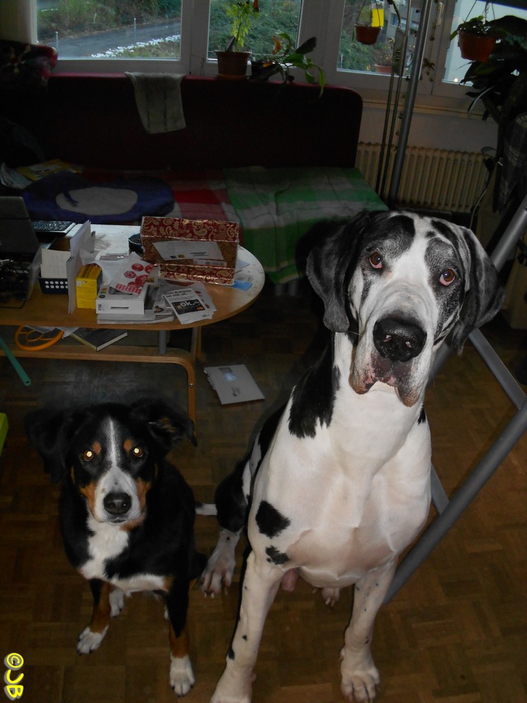 Hihi, diese große, besitzergreifende Hundepfote ist hoffentlich nicht schneller mit Auspacken Sehr schöner Hund übrigens (Doggen find ich klasse, auch wenn Wichtel nur ganz klein sind), der andere natürlich auch Aber wahrscheinlich bewacht der große Hund nur ganz brav das Päckchen