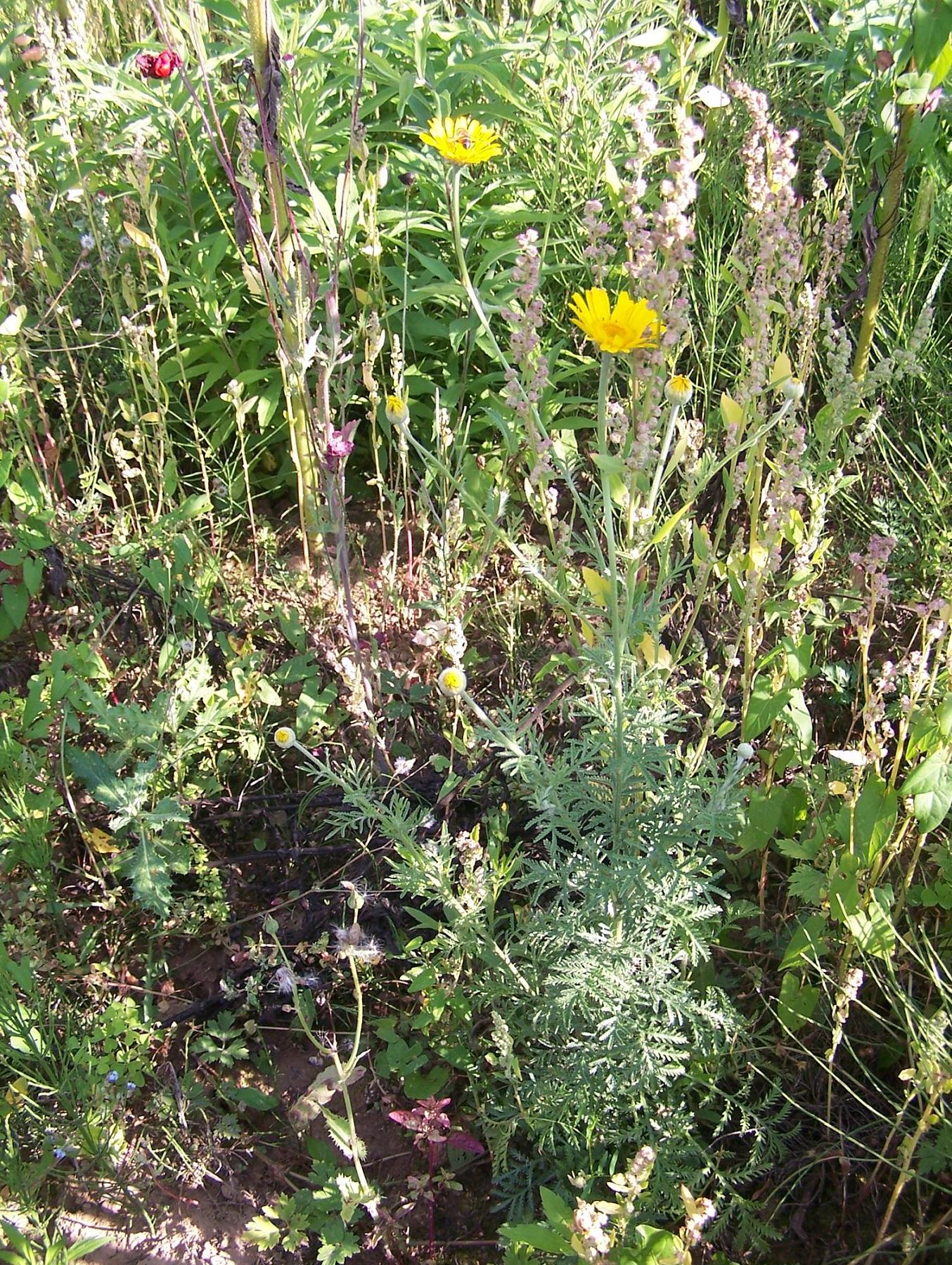 Dieses einzelne Exemplar wächst auf einem Acker am Rand von Sonnenblumen.