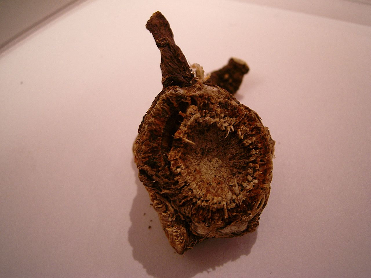 Keine Ahnung! Eingetrockneter abgeschnittener dicker Stängel? Alter Blütenstand? Irgendeine Knolle? Rest einer Frucht? Irgendwie könnte das alles sein - ich glaube, das gehört kompostiert!