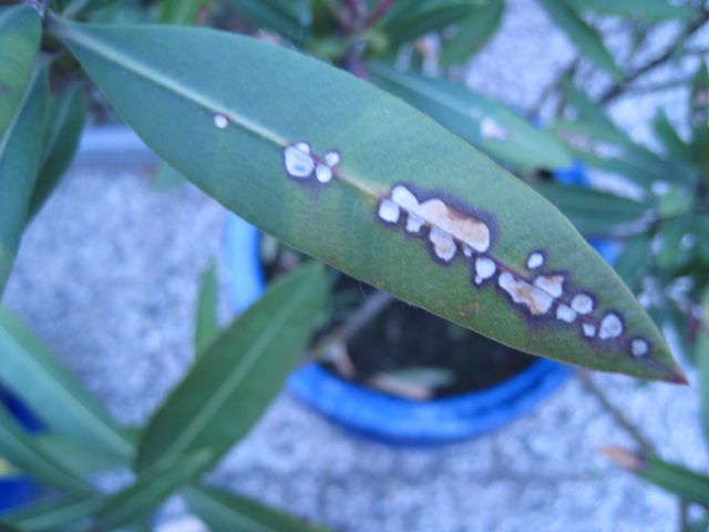 habe eben auf den Blättern meines Oleanders weiße Flecken entdeckt, aber nicht die Ursache dafür entdeckt. Bitte helft mir, damit er keinen weiteren Schaden nimmt. Danke im voraus.