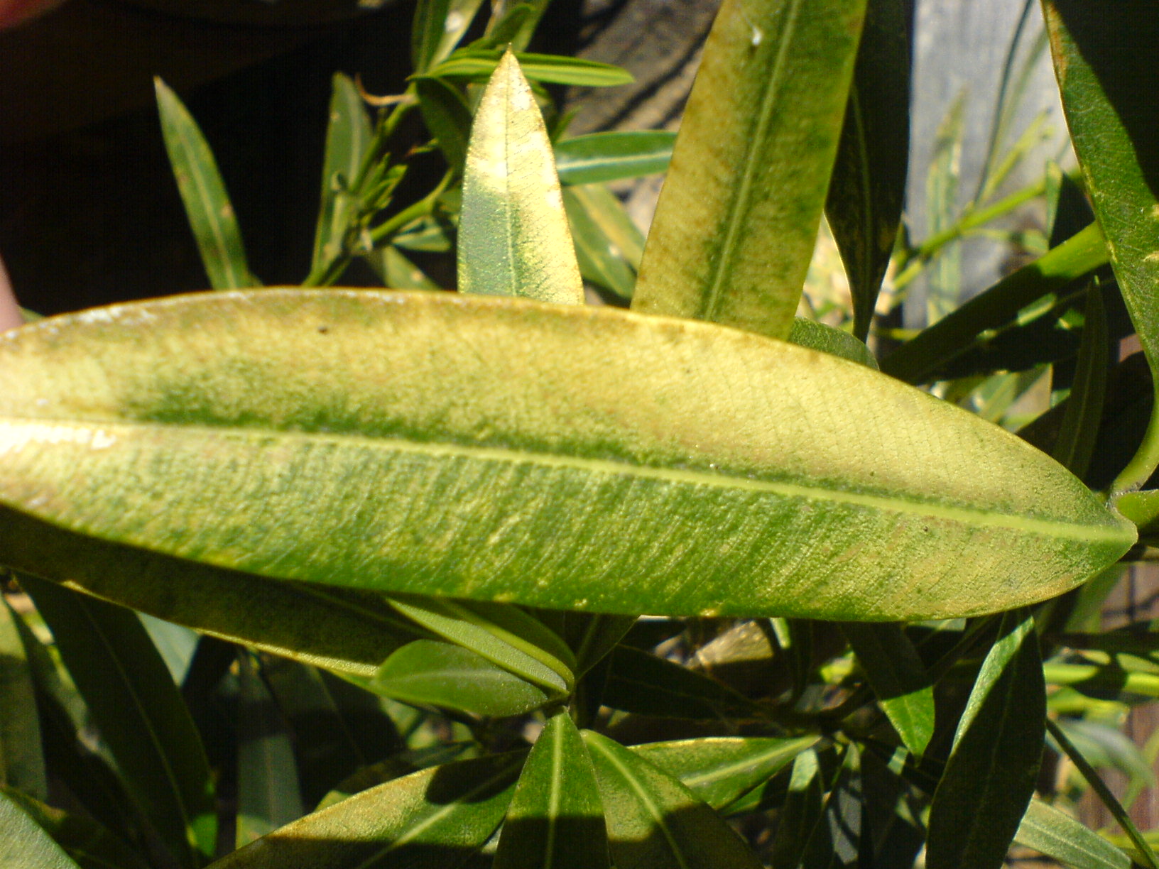 mein Oleander hat die Überwinterung im Keller gut überstanden, nur das er komische Blätter hat. Ich dachte erst das gibt sich wieder aber auch die neu gewachsenen Blätter sehen so befleckt, weiß braun aus.
