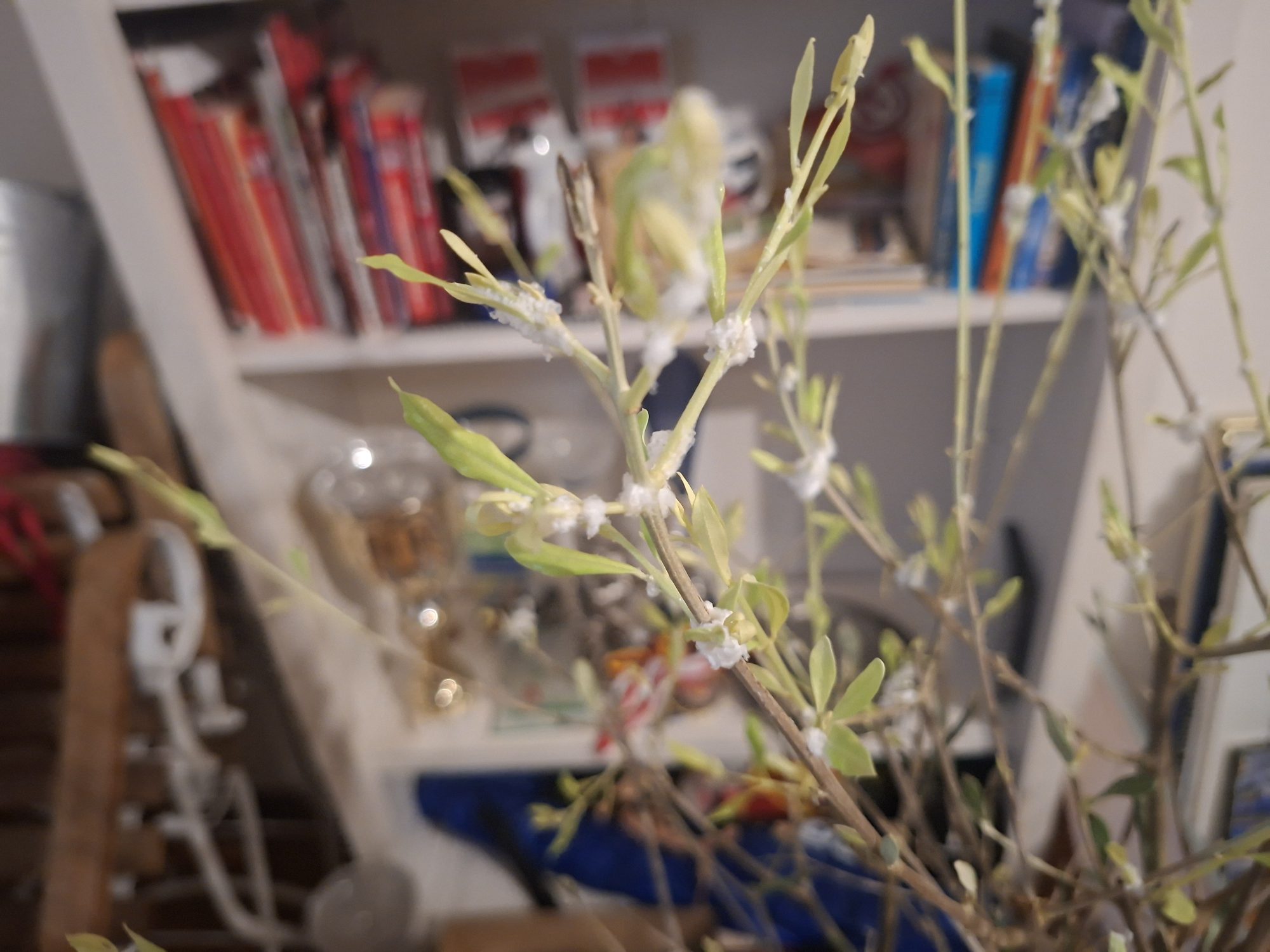 Sie hat alle Blätter verloren,bekam aber neue hellgrüne Stengel,mit weißen Gebilden