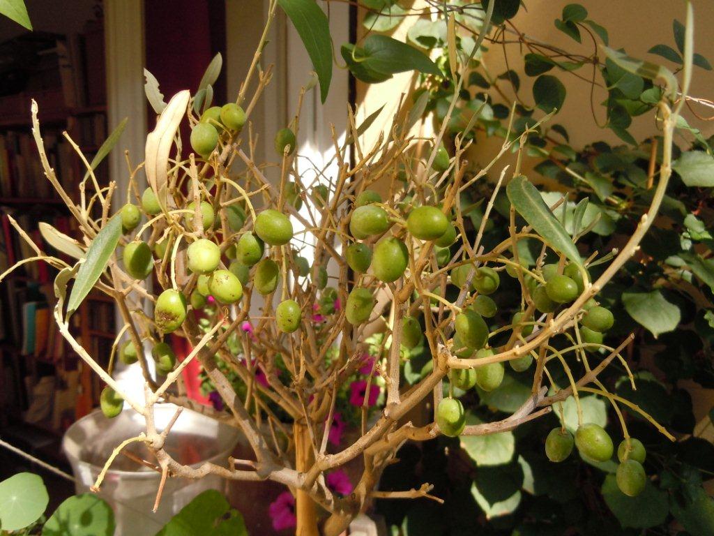Zu hause habe ich das erst einmal versucht abzuduschen so gut es ging, und in lockere, mit Blähton und etwas Hornspänen versetzte Anzuchterde gesetzt, es steht jetzt auf dem Balkon. Ich hoffe dass es sich bei dem warmen Wetter erholen wird - hat jemand noch Tips was ich ihm Gutes tun könnte? Es hat fast keine Blätter mehr, aber etliche kleine grüne Oliven - die verschrumpelten habe ich abgenommen...