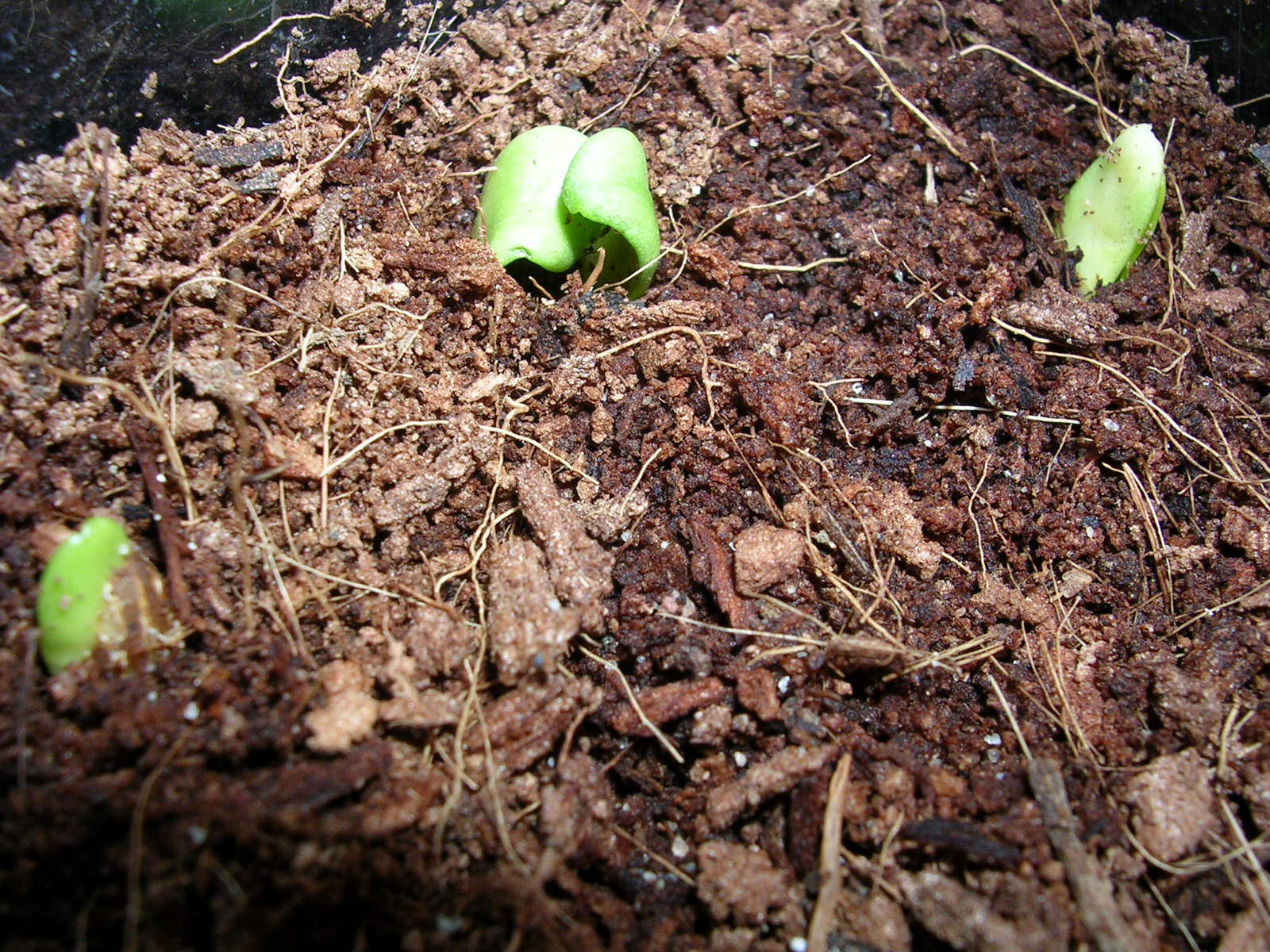 Unten im Bild, sehr unscharf, sieht man zwei noch aneinander klebende Keimblätter. Diese sind von einem Kern, den ich am 19. März nackt, also ohne die dicke Schale, ins Kokohum gegeben habe. Die Wurzel ist auch erst so kurz wie die des anderen Kerns- ich hoffe ich bekomme den Keimling durch