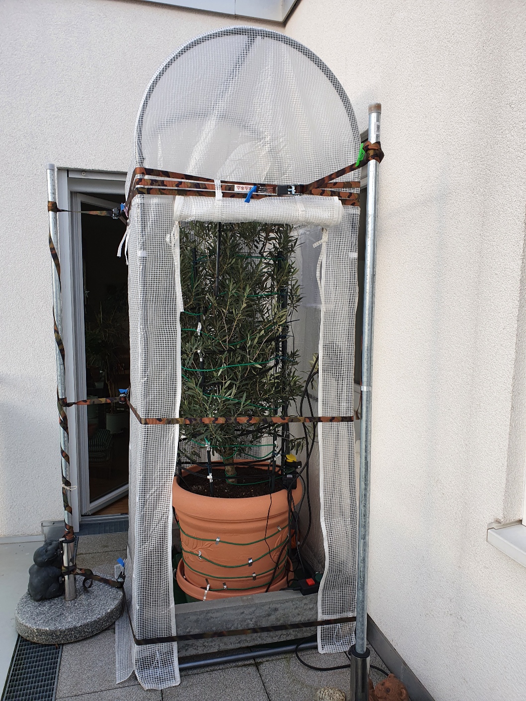 Da ich die Hauswand nicht anbohren darf, habe ich mir folgende Lösung ausgedacht. Wir haben 3 schwere Granit-Sonnenschirmständer, die im Winter natürlich unbenutzt auf dem Balkon stehen. Ich kaufte also 3 verzinkte Wasserrohre (2 m lang) mit einem Außendurchmesser von 33 mm und steckte die in die Sonnenschirmständer. Das Zelt baute ich dann in einer Ecke des Balkons auf, wo es vor Nord- und Ost-Winden geschützt ist. Die Ständer platzierte ich an 3 Seiten des Zeltes. Dann besorgte ich mir eine ausreichende Anzahl von Spanngurten, die jeweils mit den Wasserrohren verbunden sind. Zur Beschwerung des Zeltes hatte ich zusätzlich 2 45 kg schwere Betonrandsteine über die Bodenträger des Zeltgerüstes gelegt und von unten entsprechend abgestützt. Diese Konstruktion hat dann tatsächlich den heftigen Sturmböen dieses Winters getrotzt.
