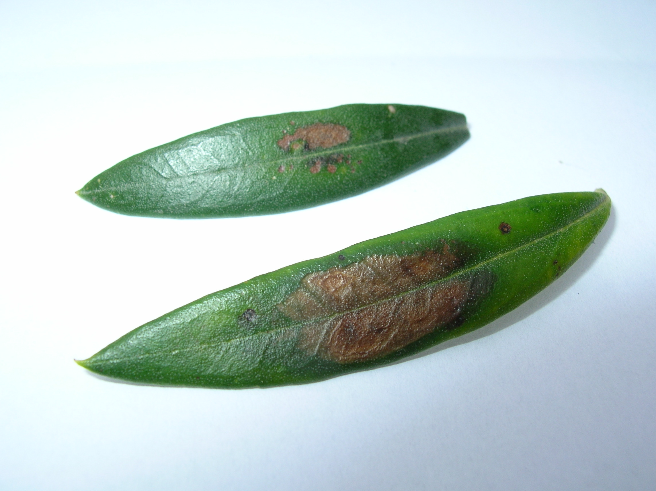 mein auf dem Südbalkon und im Kübel stehendes Olivenbäumchen (2 m) bekommt seit etwa Mitte Juni in einem unteren Teilbereich des Bewuchses nacheinander auf den Blattoberseiten zunächst kleinere mattgrüne und kaum wahrnehmbare Flecken, die sich dann innerhalb weniger Tage vergrößern und einen dunkelbraunen Farbton annehmen. Die Blätter an der Triebspitze sind nicht befallen. Inzwischen gibt es schon mehrere recht kahle Zweige. Ich tippe auf eine der vielen Blattfleckenkrankheiten, also eine Pilzerkrankung und füge 2 Fotos bei, die den Fortgang am Blatt recht gut verdeutlichen.