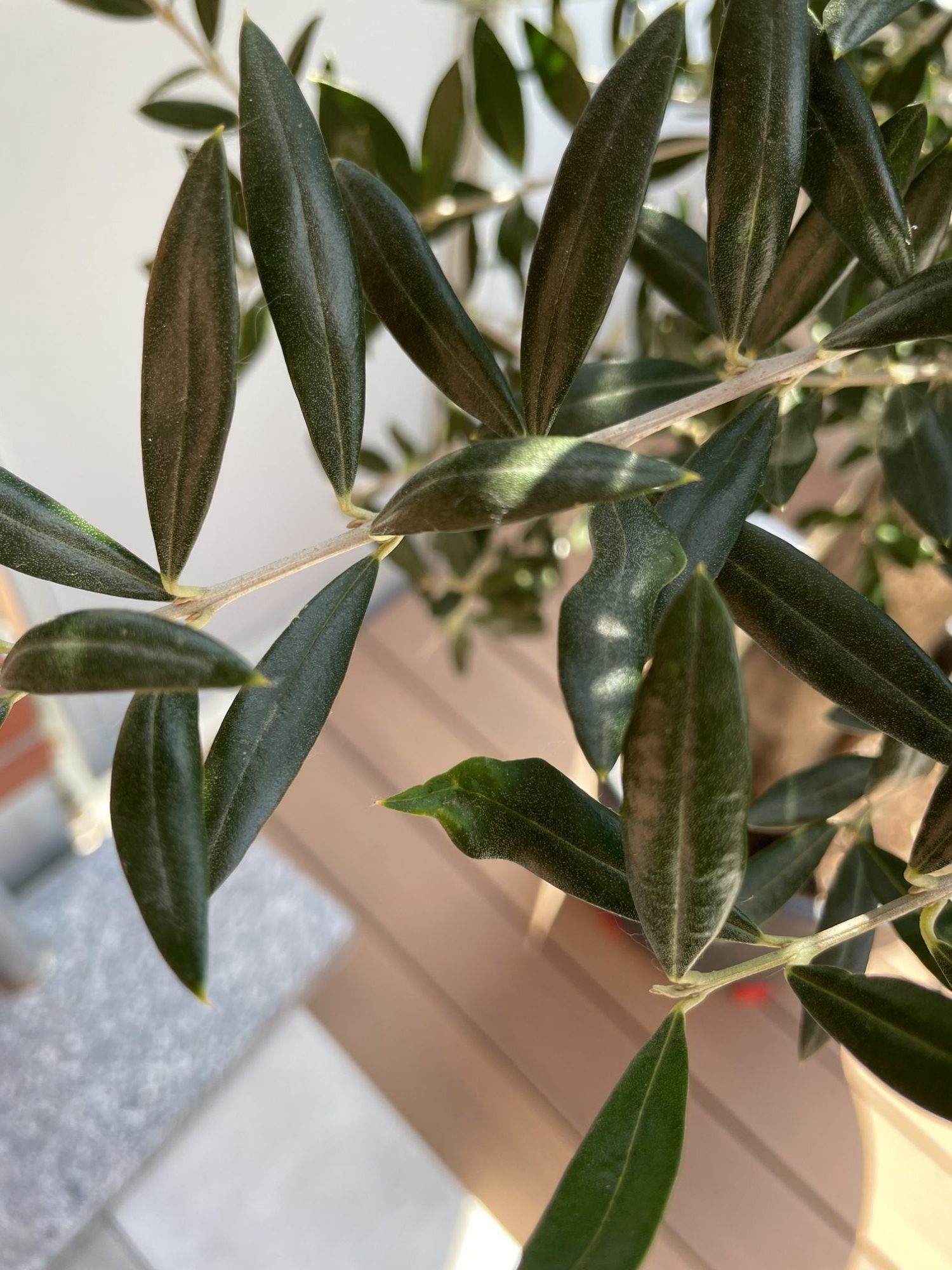 ich habe nun seit knapp 6 Wochen einen schönen Olivenbaum auf meiner Terrasse mit Südlage. An sich scheint es dem Baum recht gut zu gehen, jeder Ast weist neue Blätter / Triebe auf, das Grün der Blätter ist schön dunkelgrün.